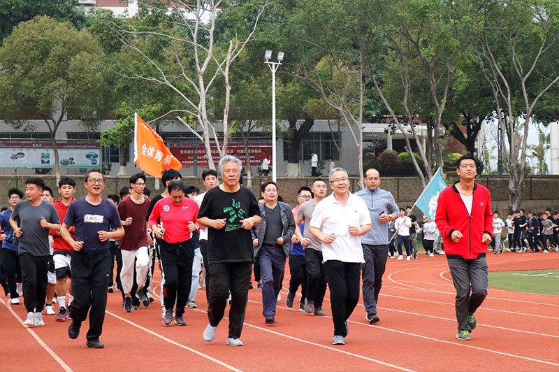 长跑正式开始,学校党政领导领跑,带领全场师生环学校田径场标准跑道跑步2000米。
