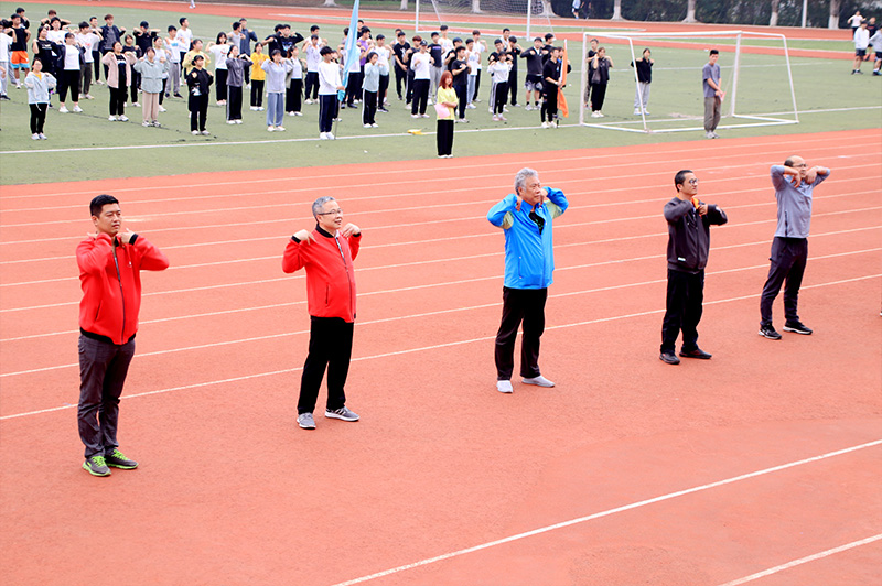 长跑开始前,在社会体育系师生的带领下,参加活动的全体师生跟随口令在田径场上进行热身操练习。随后,全场师生朗诵毛泽东诗词《七律·长征》,一字一句,铿锵有力,参加活动师生们的心灵无不受到了深深的触动。