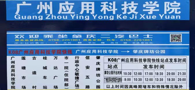 为方便广州应用科技学院(肇庆校区)师生们出行,自2021年9月11日起,肇庆市第二公共汽车有限公司增开K08广州应用科技学院—肇庆牌坊公园快线,接送师生出行。