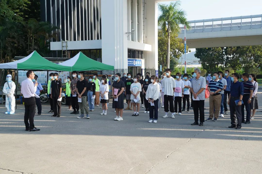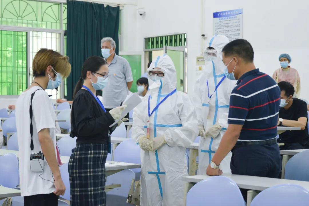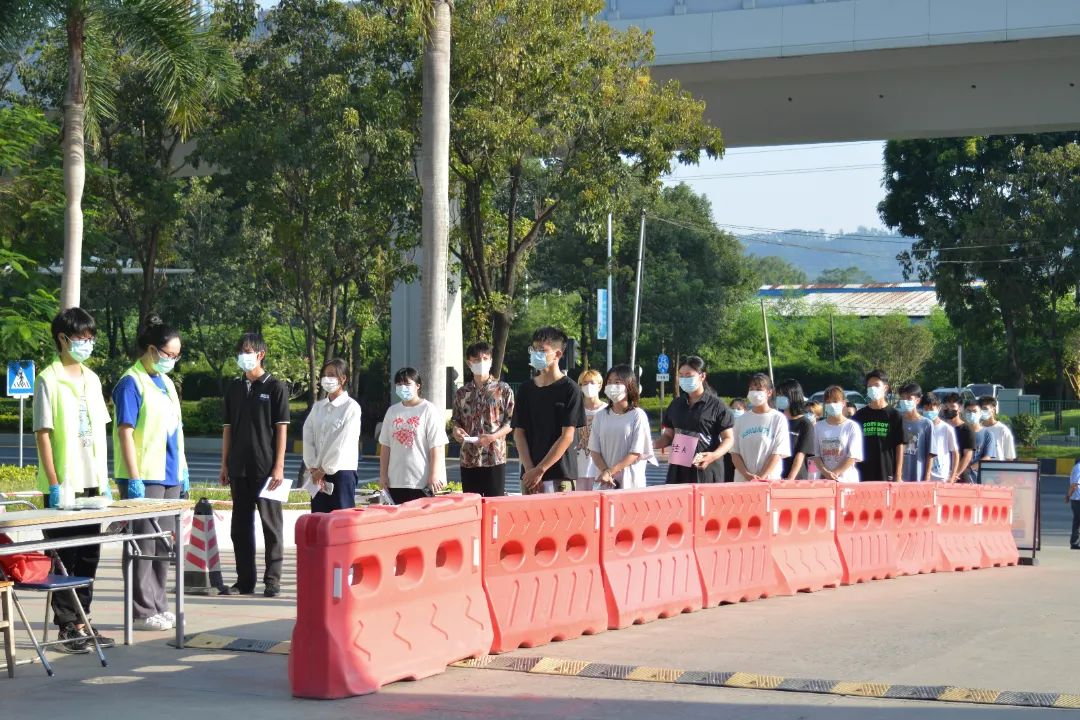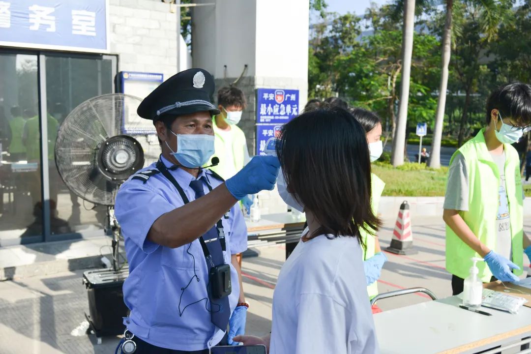 考生在校门口依次间隔1米排队进入考点,考点工作人员对考生查验“粤康码”、“通信大数据行程卡”、《健康情况声明书》、考前72小时内核酸检测结果阴性证明、准考证、有效居民身份证原件并测量体温。