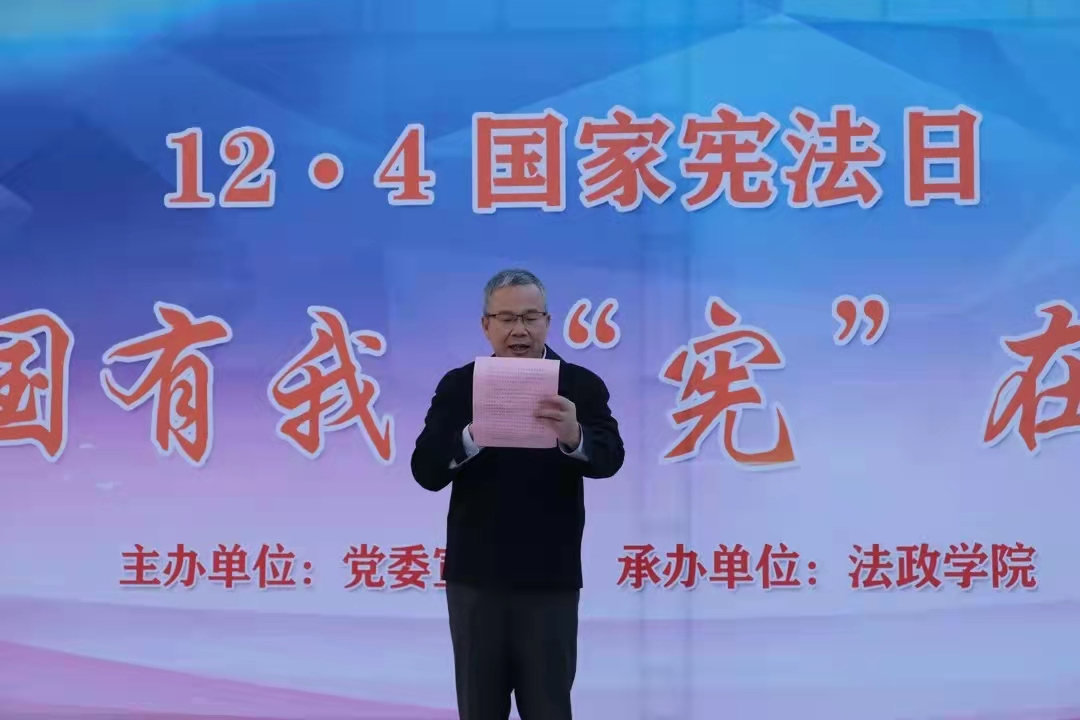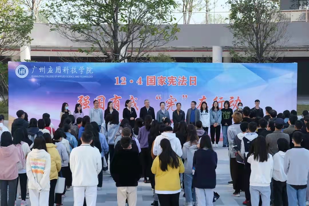 我校于12月3日下午在肇庆校区科技广场举办以“强国有我,‘宪’在出发”为主题的趣味普法活动。学校党委书记王永云、副校长刘志新等校领导,以及法政学院院长梁玉霞等领导出席活动。王永云书记在活动仪式上发表了讲话。王永云书记表示:“同学们应‘惟用法律自绳己’,自觉敬仰宪法、遵守宪法,做宪法的崇尚者、遵守者、捍卫者。”他对同学们提出了三点希望:一是怀抱理想,树牢信仰;二是加强学习,提升素养;三是知宪于心,守法于行。