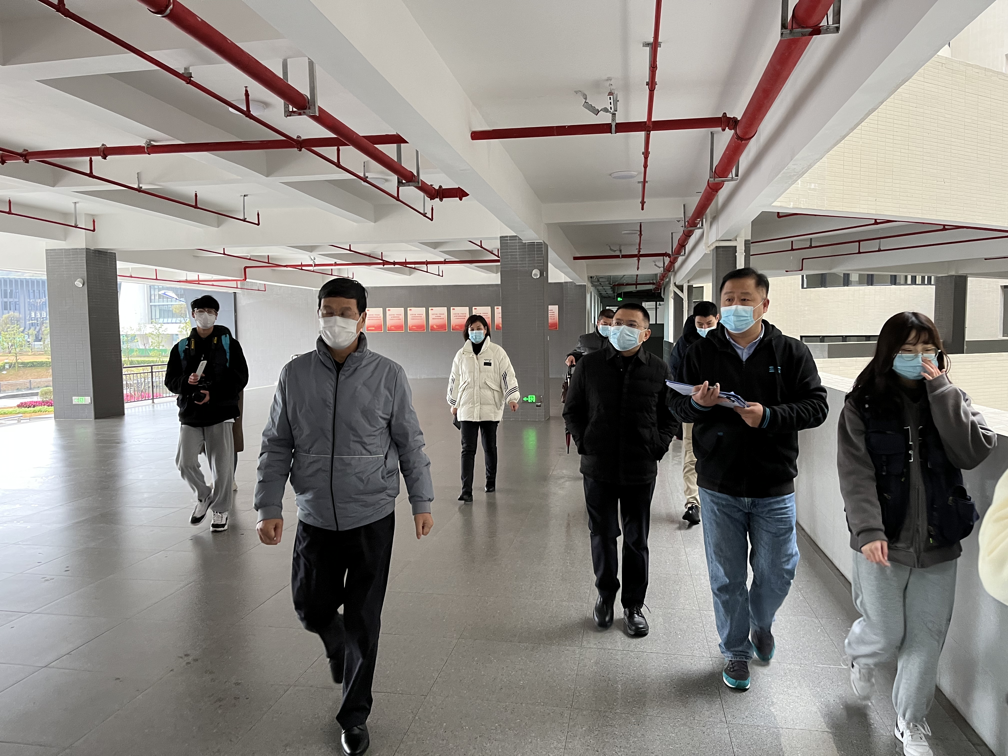 ▲ 执行校长庞永师(左一)等校领导在广州校区检查开学首日教学情况。