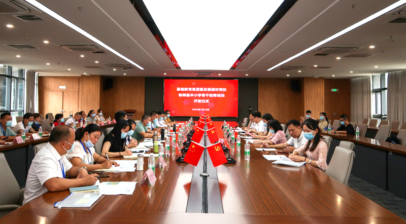 为贯彻落实省委、省政府关于推动基础教育高质量发展的工作要求,做好全口径全方位融入式帮扶粤东粤西粤北地区基础教育高质量发展工作,7月18日—21日,基础教育高质量发展结对帮扶——徐闻县中小学骨干教师培训在我校举行。来自湛江徐闻县下桥镇中心小学、西连镇瓜藤小学、西连镇石马小学、西连镇乐琴小学、西连镇龙腋小学、城北乡中心小学、角尾乡中心小学等学校的校长和教师代表参加了培训。我校副校长李江凌、校长助理欧仕身代表学校主持此次帮扶培训。