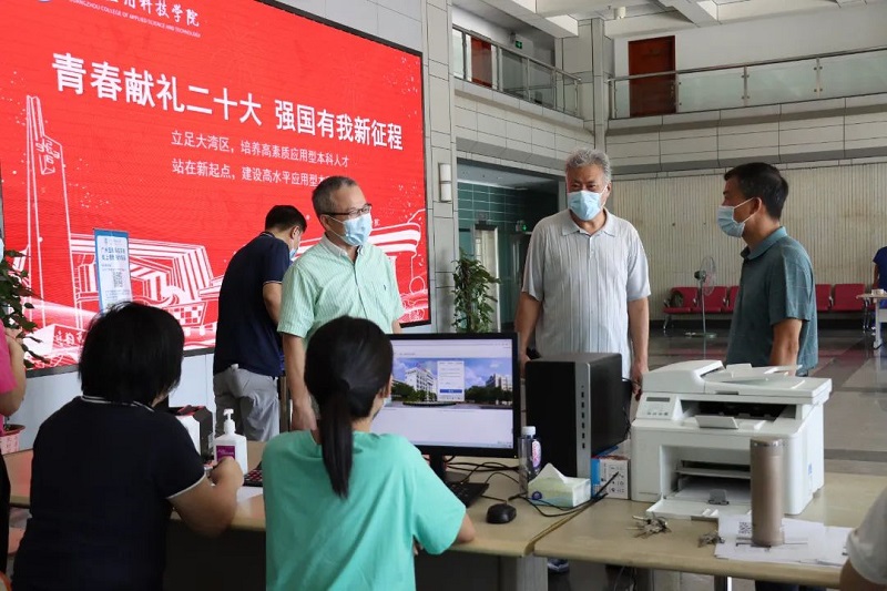 8月28日,学校执行校长庞永师、党委书记王永云、校长助理欧仕身等校领导在广州校区迎新现场督导工作,看望迎新志愿者,关心新生报到情况。在肇庆校区迎新准备现场,校长刘剑锋、常务副校长吴舸、副校长刘志新、副校长李荆松检查各个迎新接待点,对8月29日迎新报到工作进行“再细化”。