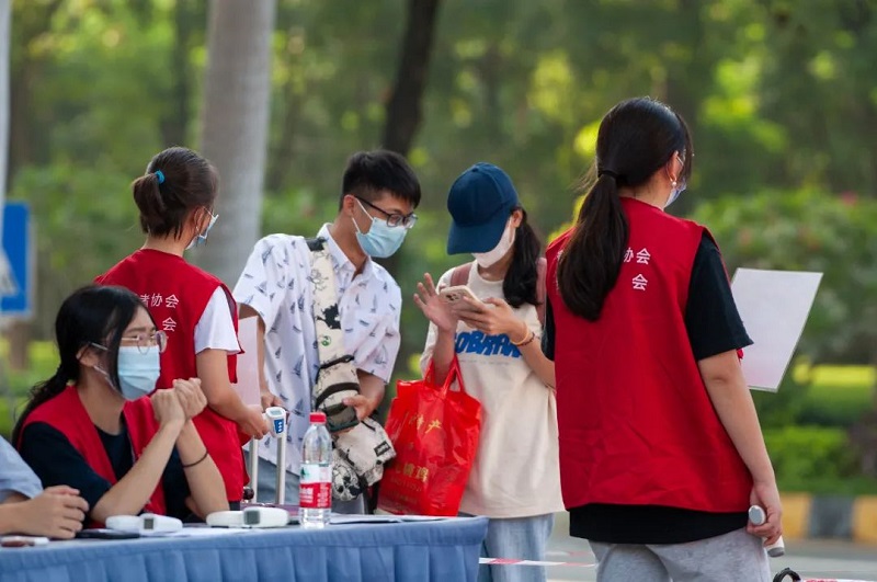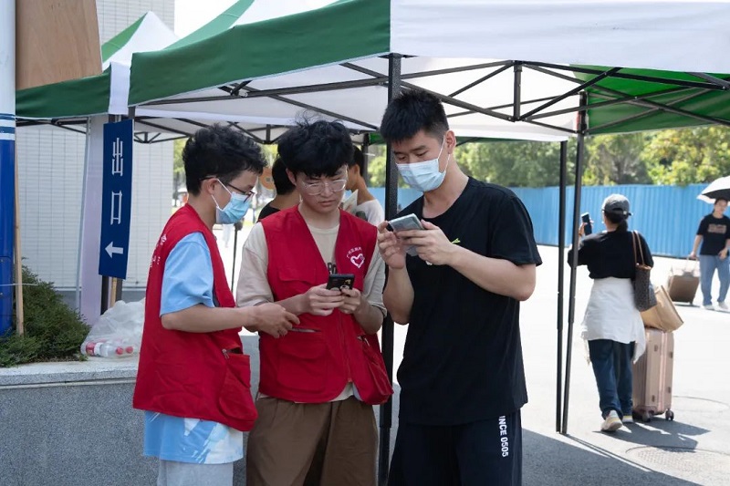 在疫情防控常态化的背景下,从校门口开始做好新生报到防控检测、测温、行李箱消杀确保“绿码”进校。做实、做细疫情防控工作,引导车辆和新生家长有序进校,确保学生报到安全顺畅。