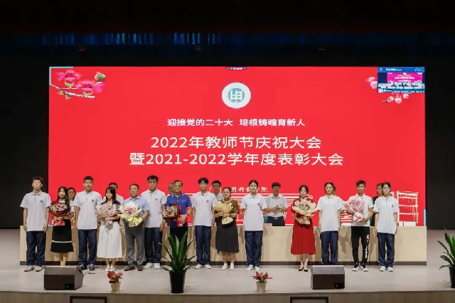在第38个教师节即将到来之际,9月9日,我校召开2022年教师节庆祝大会暨2021-2022学年度表彰大会。我校董事长王睿,校长刘剑锋,执行校长庞永师,党委书记王永云,常务副校长吴舸,副校长李江凌、刘志新、李荆松,校长助理欧仕身等全体党政领导出席大会,全校教职工参加大会。大会由党委书记王永云主持。