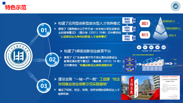 近年来,学校全面深化创新创业教育改革,贯彻《国务院办公厅关于进一步支持大学生创新创业的指导意见》(国办发〔2021〕35号)文件要求的“以创新创业为导向的新型人才培养模式”,构建了应用型创新型复合型人才培养模式;贯彻《广东省教育厅关于深化高校创新创业教育改革的若干意见》(粤教高〔2015〕16 号)文件要求的“构建创新创业梯级课程体系”,构建了“5梯级”创新创业教育平台;开展“普惠式”创新创业通识教育;建设“精英式”示范实践教育基地。取得创新创业教育系列成果:获取“广东省高校就业创业特色示范课”;获批工信部“校企协同就业创业创新示范实践基地”建设项目;获得中国国际“互联网+”大学生创新创业大赛省赛优秀组织奖3次,以及银奖等奖项。