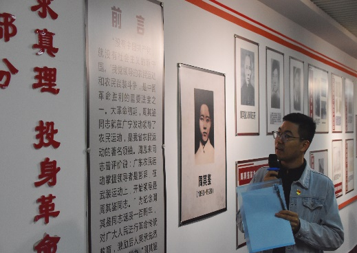 第一站我们来到红色文化研究室中国工农红军广宁周其鉴红军中学,教工第二党支部副书记高栋同志带领党员同志参观周其鉴纪念馆,介绍了周其鉴投身革命,领导广宁农民运动、广东农民运动和土地革命期间的斗争经历,让我们了解了周其鉴光辉灿烂的一生,随后步行参观了周其鉴故居。正值“一二·九”运动88周年这个特殊的日子,高书记还给我们介绍了“一二九运动”的历史背景及意义,回顾了“一二九”运动的光荣历史,带领全体党员面对党旗举起右拳重温了入党誓词,激起了所有党员同志对于日本帝国主义侵略中国的愤慨,点燃了大家的满腔爱国之情。