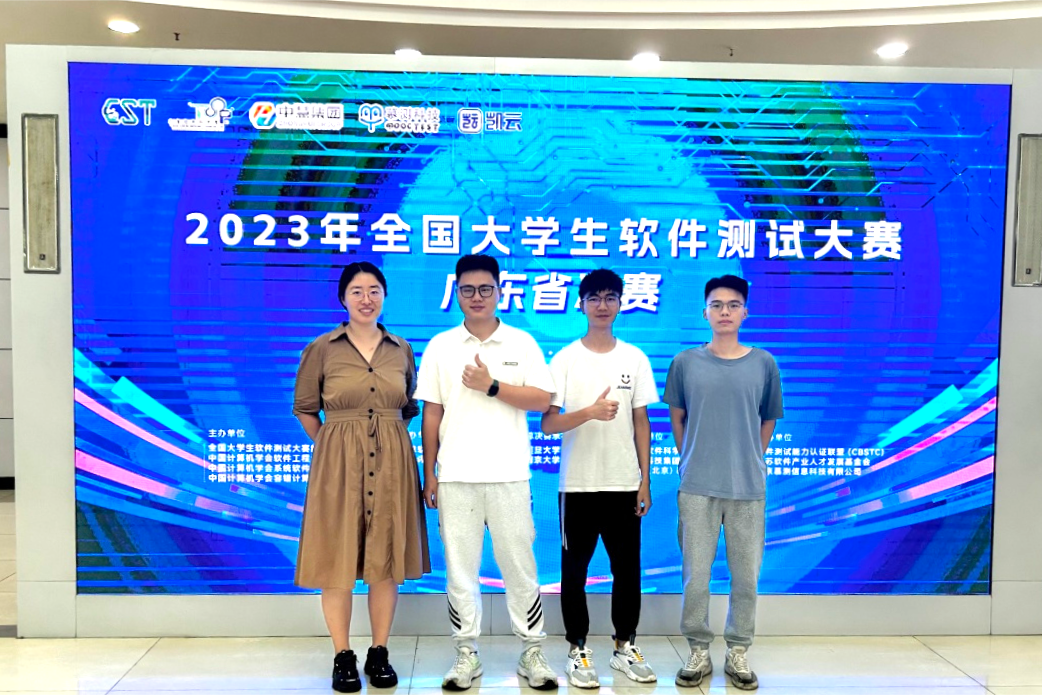 此次比赛,是我校计算机学院首次参加全国大学生软件测试大赛,尹老师与米老师带领同学们第一次外出参加比赛。参赛同学们在第一次参与该赛事中,便取得了广东省一等奖的好成绩,并且有两位同学成功晋级全国决赛,尹老师说,“我对此多次赞扬参赛同学们在比赛中表现优秀”。在比赛过程中,尹老师为同学们提供赛事准备,且带领学生先后前往广州和上海参加比赛。