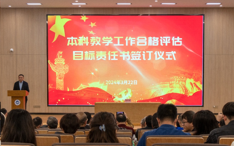 为切实推进学校本科教学合格评估项目实施方案落地,促进各二级单位自评自建工作,确保学校顺利通过教育部本科教学工作合格评估,3月22日下午,学校本科教学工作合格评估目标责任书签订仪式在图书馆一楼报告厅举行。全体校领导,中层干部,校院两级教学督导,各学院专业负责人、系正副主任、教研室主任、办公室主任、教务办主任,科级以上教职员参加了会议。会议由吴舸常务副校长主持。