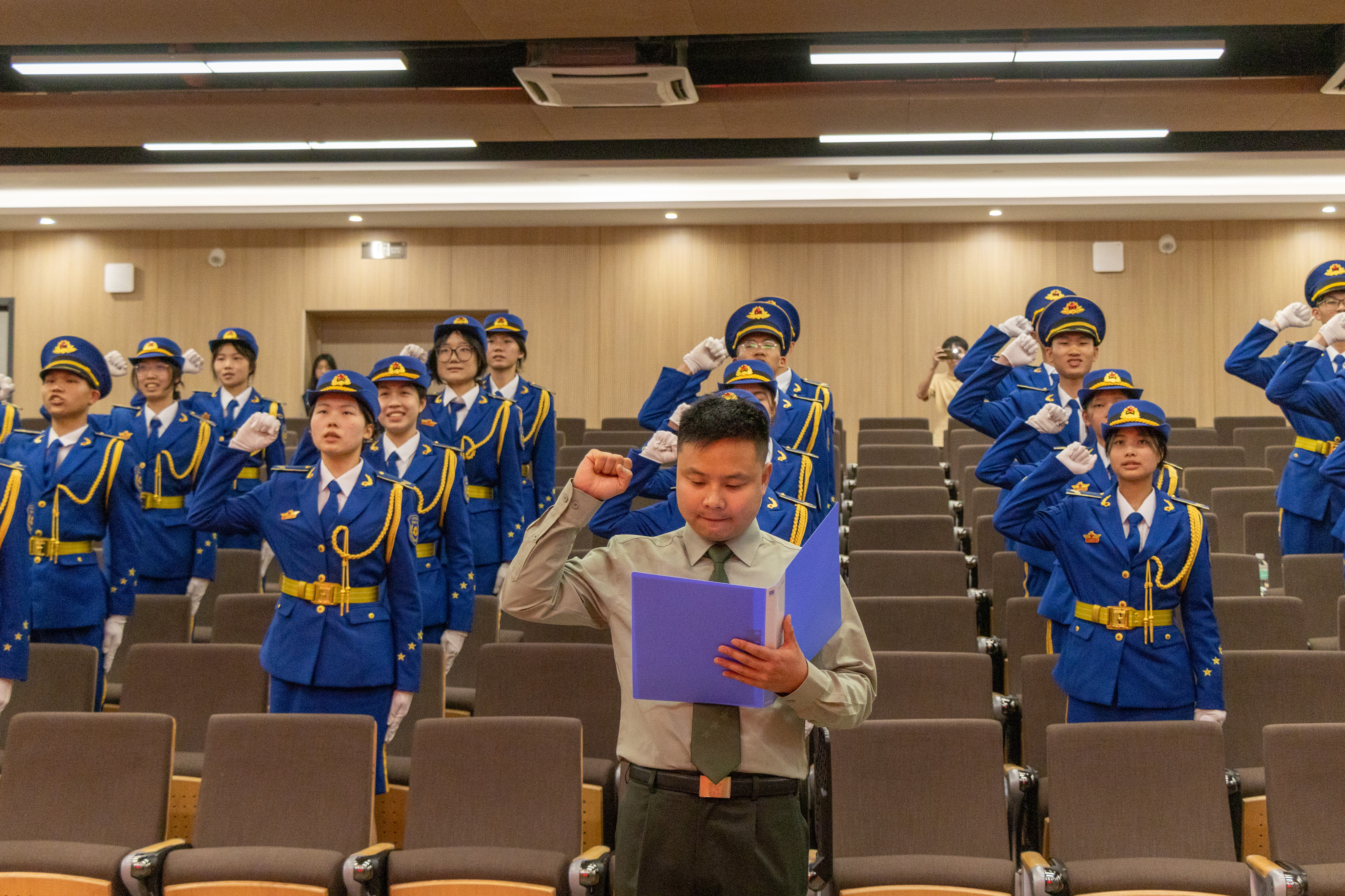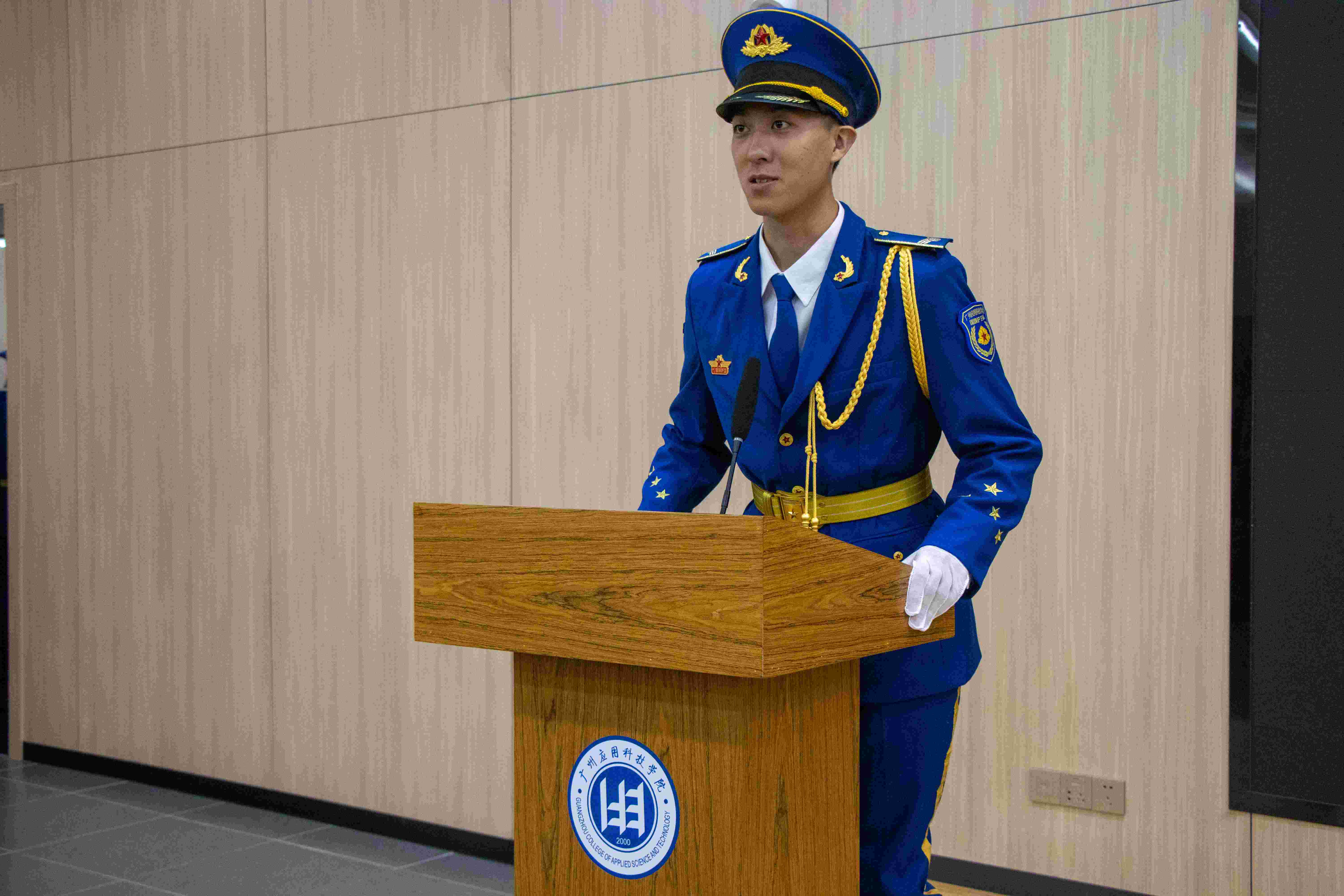 党委副书记刘志新为我校国旗护卫队授旗并作动员讲话。她指出,国旗是国家的象征,是民族的尊严,国旗护卫队是守护这份尊严的重要力量。学校转设更名以来,国旗护卫队队员们以坚定的信念和优良的作风,为学校的国旗护卫工作作出了突出贡献。她希望国旗护卫队队员以天安门国旗护卫队为最高标准,在内心深处烙下爱校、爱党、爱国的印记。她强调,国旗护卫队代表广应科,不仅展现了广应科学子的精神风貌,更是其信仰升华所在。队员们应怀揣对国家的热爱与崇高敬意,积极参与全省大学生国旗护卫队比赛,用一流的标准严格自己,为个人荣誉而战,为学校荣誉而战。