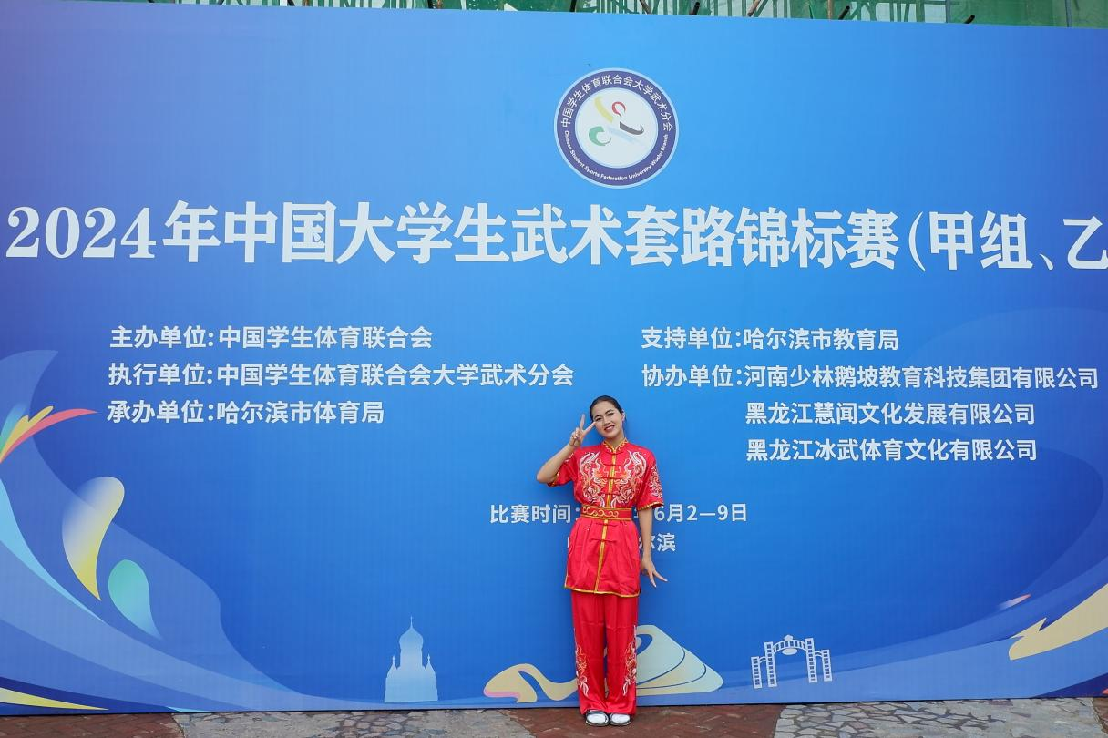6月8日,2024年中国大学生武术套路锦标赛(甲组、乙组)在哈尔滨华德学院体育馆圆满落幕。我校武术队由体育科技学院院长张军担任领队,文青云和王蕊芯两位老师担任教练共5名运动员代表学校出征赛事,经过5天的激烈角逐,最终斩获1金2银1铜的佳绩。同时文青云老师获得优秀教练员称号,蒙卓彬同学获得优秀运动员称号。