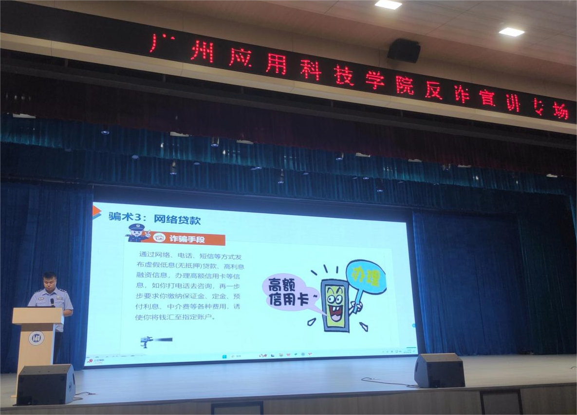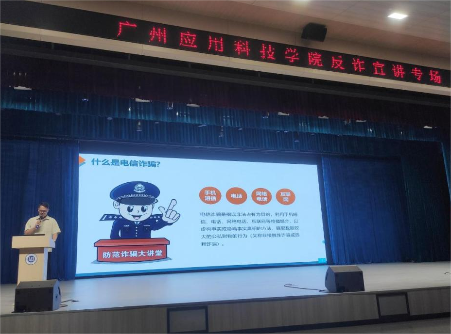 为进一步提高全院师生防范电信网络诈骗意识和能力,切实保障广大师生群体的财产安全,6月18日下午,我校在图书馆三楼小礼堂举办防范电信网络诈骗宣传讲座。本次讲座特邀肇庆市公安局鼎湖分局反诈中心高勤副队长,莲花镇派出所黄建军警官和苏桓琨警官为全校师生带来反诈知识科普,我校校长助理吴明生出席讲座,各二级学院师生代表参加讲座。