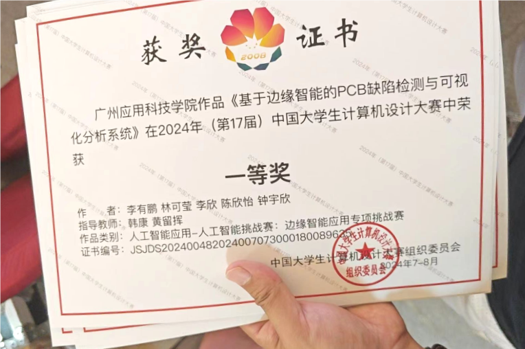 为加快人工智能创新成果的转化应用,解决国家人工智能技术的“卡脖子”问题,作为数字中国建设的重要一环,党的十八大以来以习近平同志为核心的党中央,把发展人工智能提升到战略高度出台一系列重大政策。8月8日至8月12日,第十七届中国大学生计算机设计大赛“人工智能应用-人工智能挑战赛”赛道总决赛在南京成功举办,广州应用科技学院计算机学院学生李有鹏、林可莹、李欣、钟宇欣和陈欣怡等5位同学组成的团队,以其独特的创新思维和卓越的技术实力,凭借项目《基于边缘智能的PCB缺陷检测与可视化分析系统》,夺得全国一等奖。该奖项彰显了我校计算机学院师生在计算机专业领域的造诣,为推动智能制造与人工智能技术的融合发展贡献了重要力量。