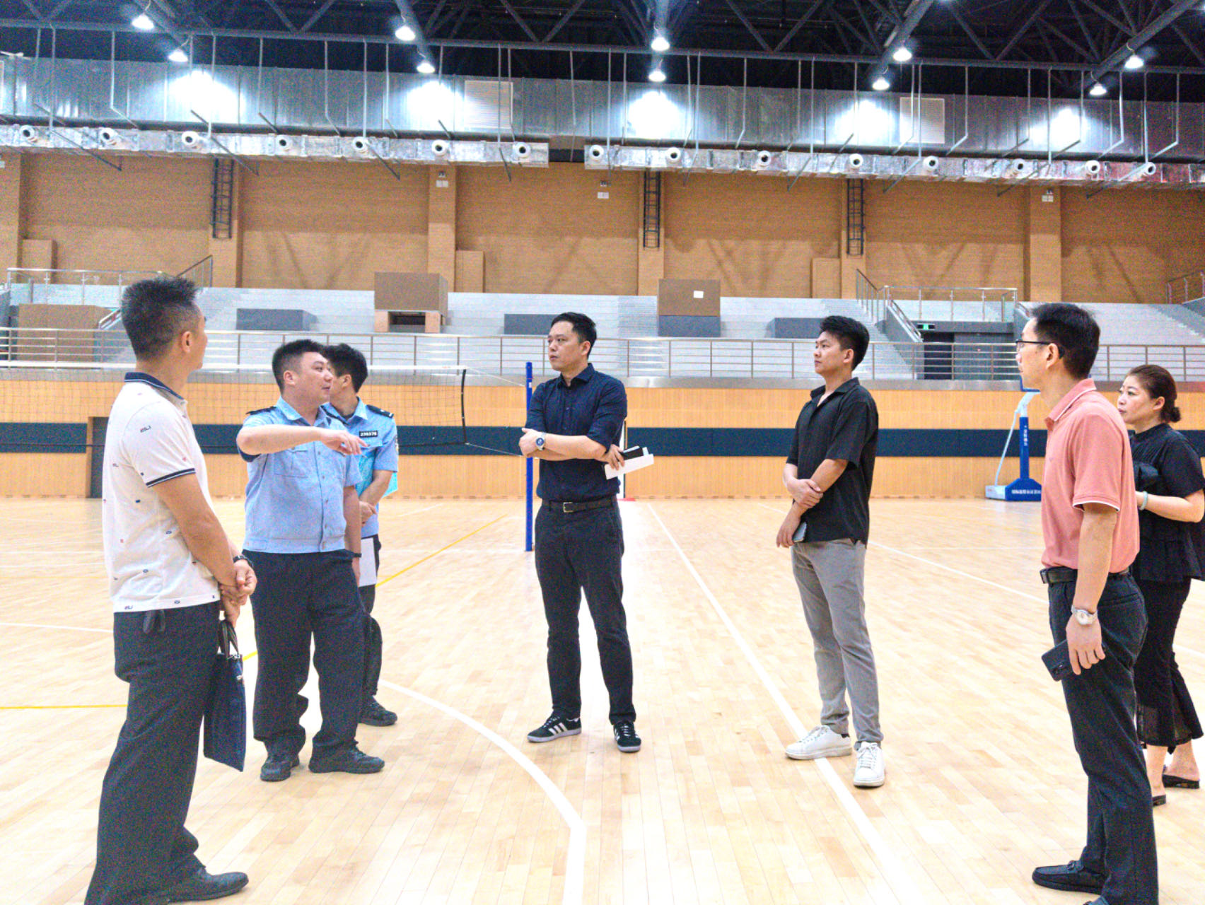 调研现场,市文广旅体局领导一行参观了我校体育馆、通过听取我校领导汇报、实地调研等方式,详细了解我校体育场馆配套设施分布位置、场地周边环境等情况,同时向我校体育场馆提出针对性建议,从基础消防设施检查、运动员休息区域、志愿者服务提供、场馆安全设备、赛事整体布局方案等方面,深入交流建设好承办赛事场馆的相关事宜,并就如何更好地满足第十五届全国运动会群众赛事活动的需求、提升赛事服务品质等问题进行了深入探讨。
