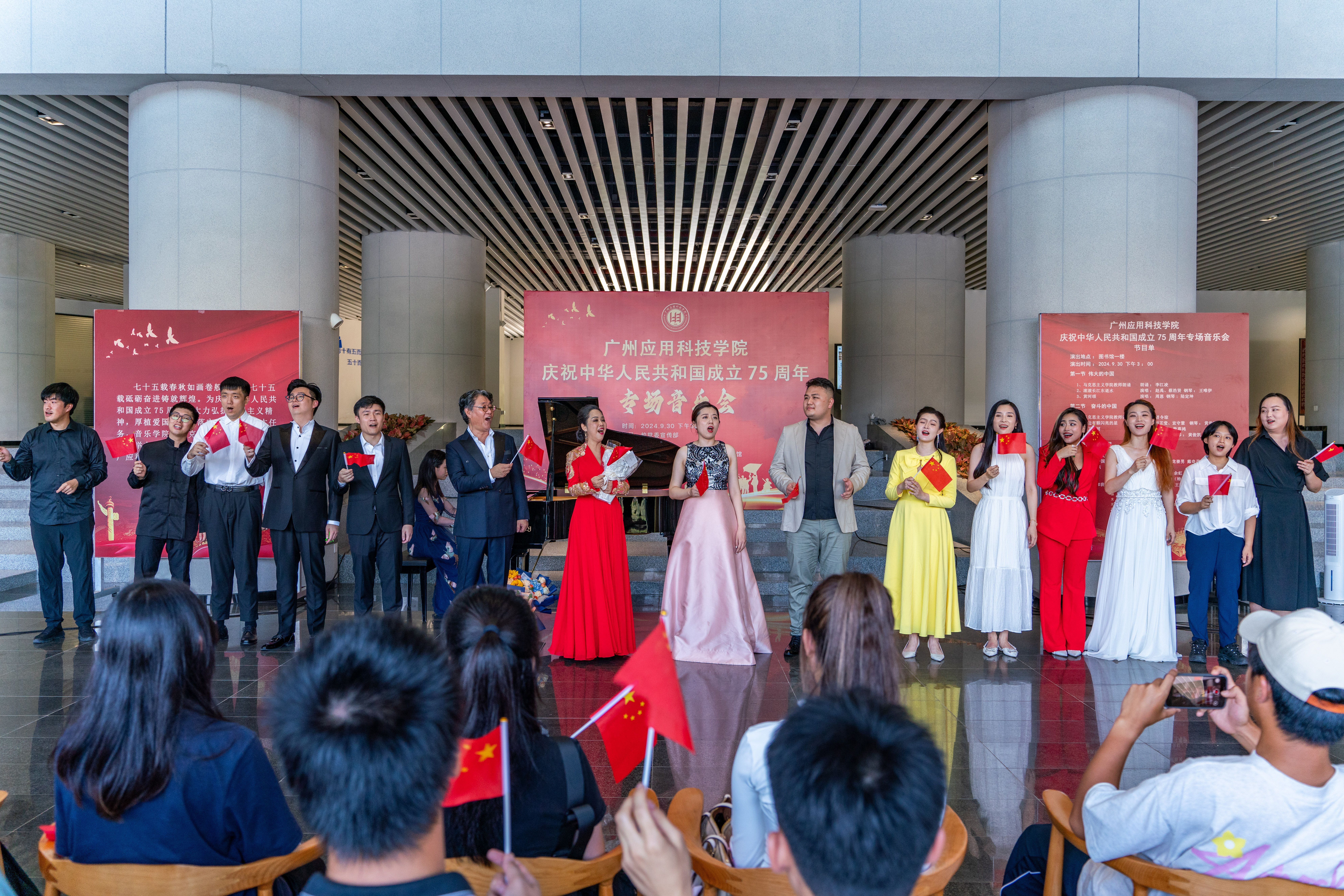 在金秋送爽、举国同庆的美好时节,广州应用科技学院洋溢着一股浓厚的节日氛围。为庆祝中华人民共和国成立75周年,9月30日下午,学校举办国庆专场音乐会,以音乐为媒介,向祖国献上最诚挚的祝福。
