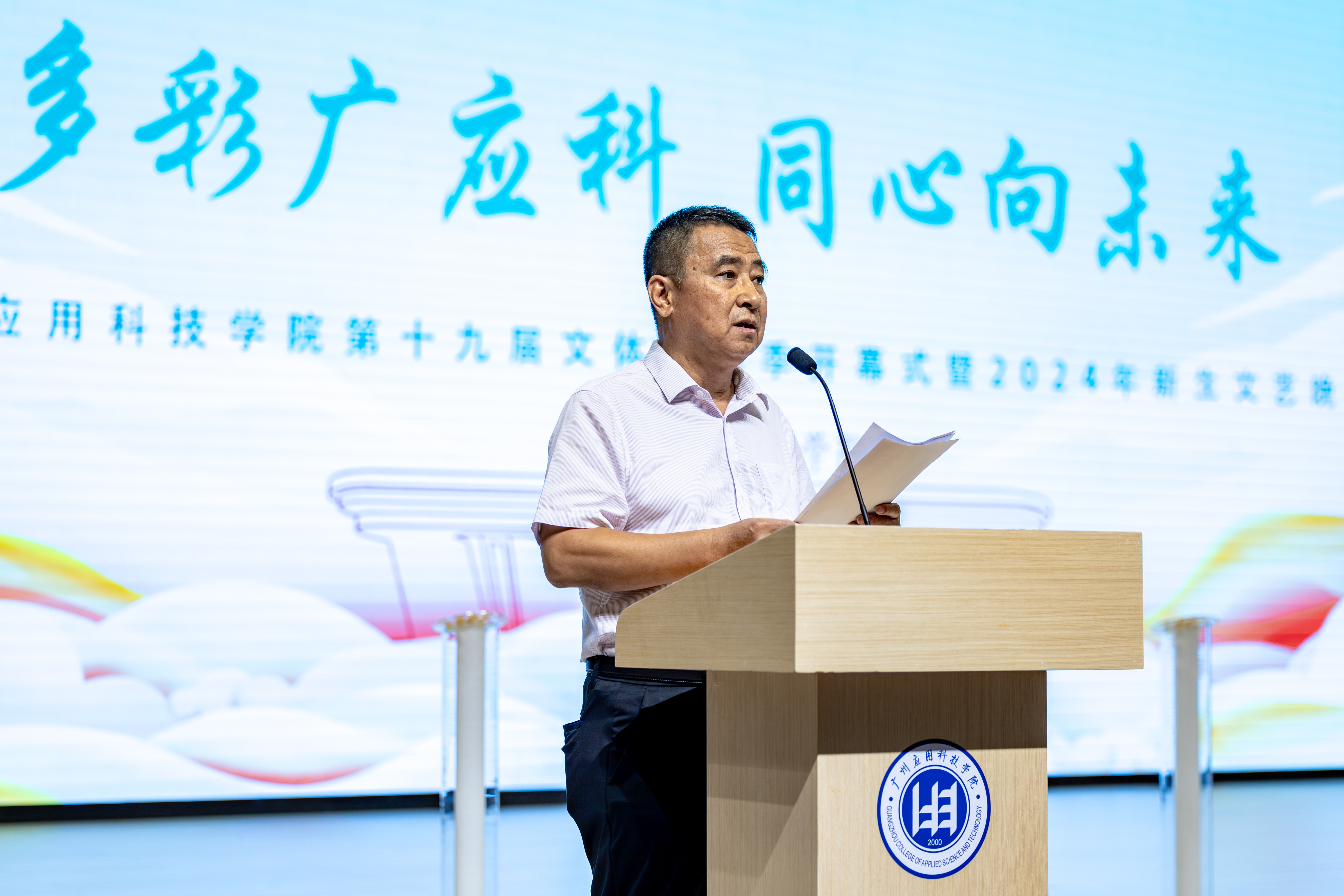 文化兴则国运兴,文化强则民族强。党的二十届三中全会提出,中国式现代化是物质文明和精神文明相协调的现代化。为深入学习贯彻党的二十届三中全会精神,深入学习贯彻习近平文化思想,坚定文化自信,坚持守正创新,落实立德树人根本任务,营造健康文明向上的校园文化艺术氛围,10月22日,广州应用科技学院第十九届校园文体艺术季在图书馆小礼堂开幕。党委书记陈光团,副校长刘志新出席开幕式,党委宣传部、校团委、学生处、各二级学院相关负责人,以及师生代表800余人参加开幕式。