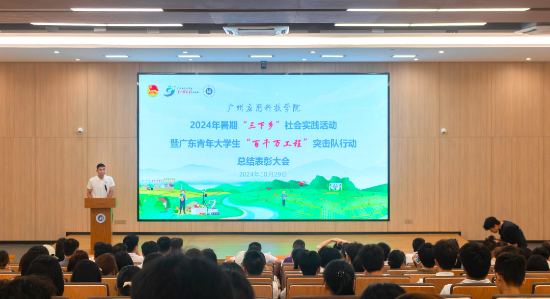 10月29日下午,我校于肇庆校区图书馆一楼报告厅召开2024年暑期“三下乡”社会实践活动总结表彰大会。校党委书记陈光团、校党委副书记刘志新出席表彰大会,党委宣传部、校团委负责人,各二级学院学生工作负责人、团委负责人,暑期“三下乡”社会实践师生代表共同参与表彰大会。表彰大会由校团委书记郭振主持。