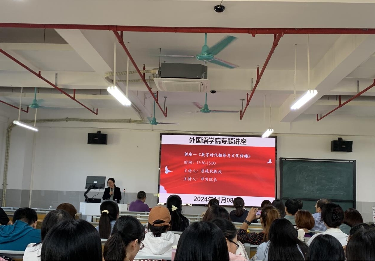 2024年11月8日下午13:30,我院特邀电子科技大学中山学院崔艳秋教授(博士)和李天刚副教授,在明德楼J2-301举办了“数字时代翻译与文化传播”和“校本大学英语课程体系建设及ESP课程开发与教学实践”两场专题讲座。讲座由邓隽院长主持,全体专任教师参加讲座。