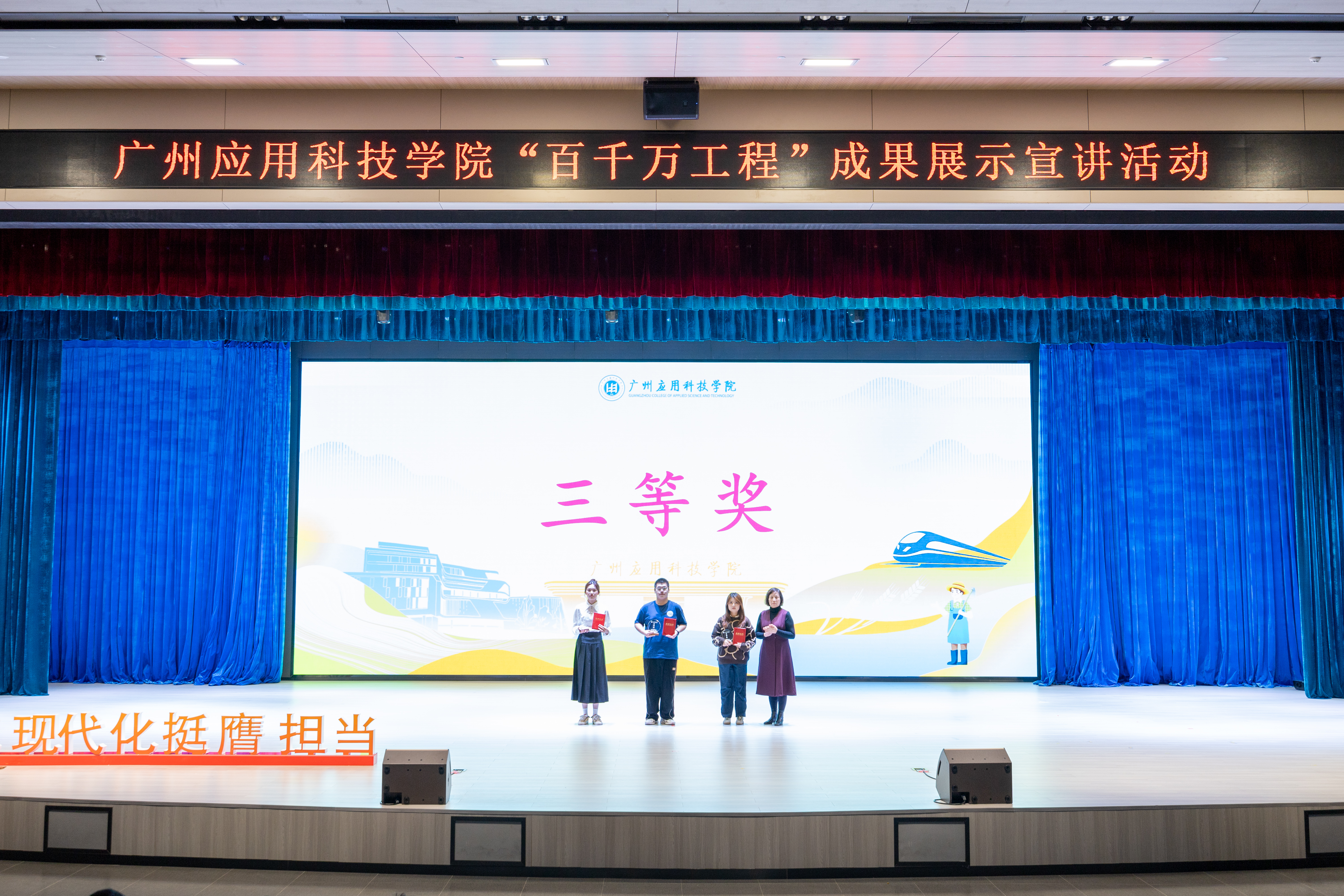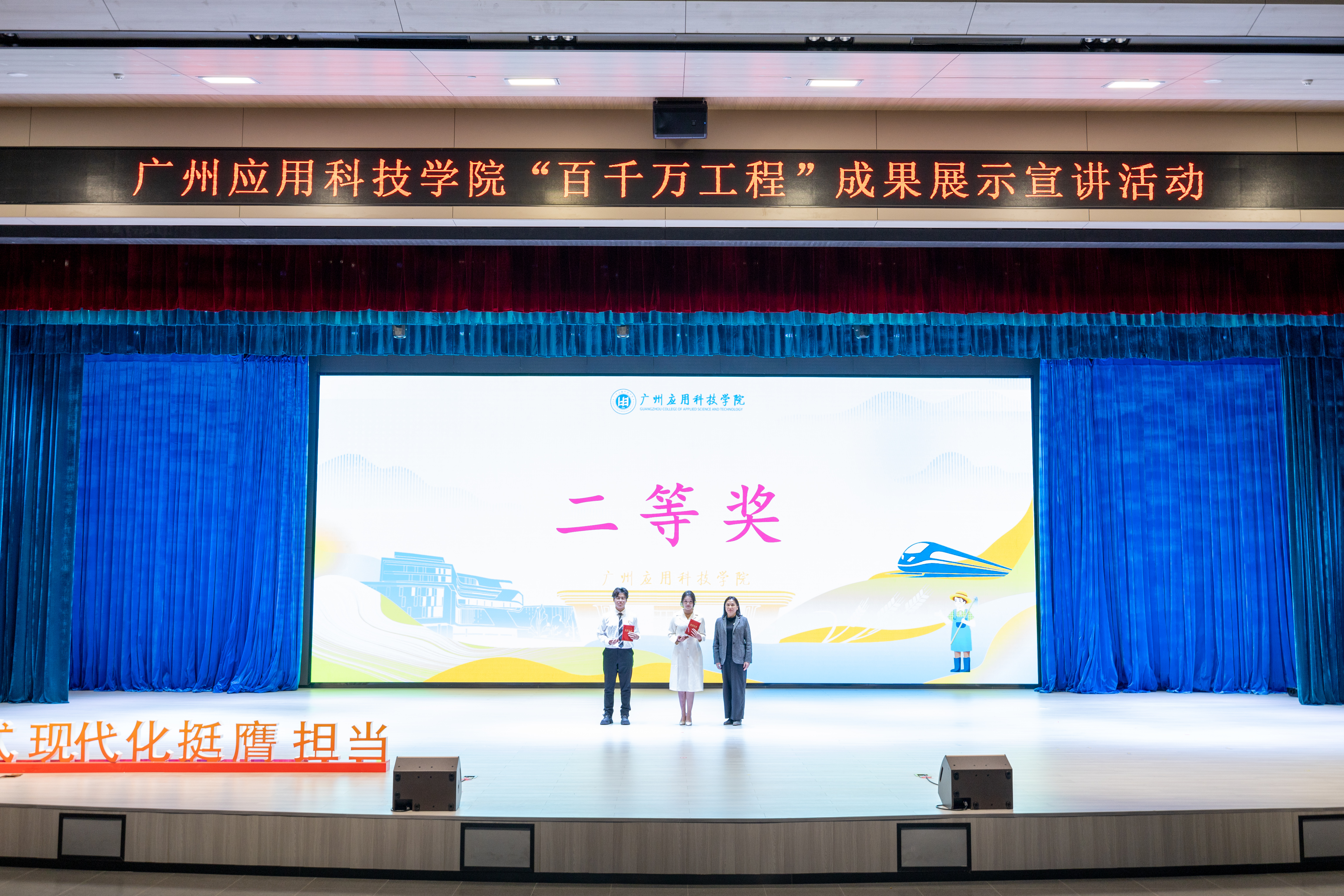 “百县千镇万村高质量发展工程”,是推动广东高质量发展的头号工程。12月11日晚,我校2024年“百千万工程”成果展示宣讲活动在图书馆三楼小礼堂举行。本次比赛由广州应用科技学院党委宣传部主办,学校工会、学生工作部、校团委、创新创业学院及各二级学院协办,来自学校9个二级学院的9支参赛队伍参与宣讲决赛。广东省教育厅督导专员、广州应用科技学院党委书记陈光团,中共肇庆市委讲师团副团长汤婉文,广州应用科技学院党委副书记刘志新,肇庆学院经济与管理学院副院长周长锋,我校党委宣传部部长李帆,创新创业学院院长荀海鹏,校“百千万工程”顾问龙镇辉,各二级学院院长、党委书记出席活动,师生代表800余人观摩决赛。