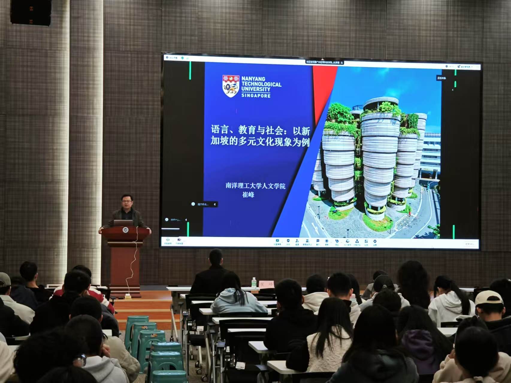 12月12日下午,“百越大讲堂”第四十九讲在行政中心一楼报告厅举行,新加坡南洋理工大学博士生导师崔峰教授应邀为我校师生作《语言、教育与社会——以新加坡的多元文化现象为例》专题讲座。校团委书记郭振及200余名师生参与讲座,讲座由郭振主持。