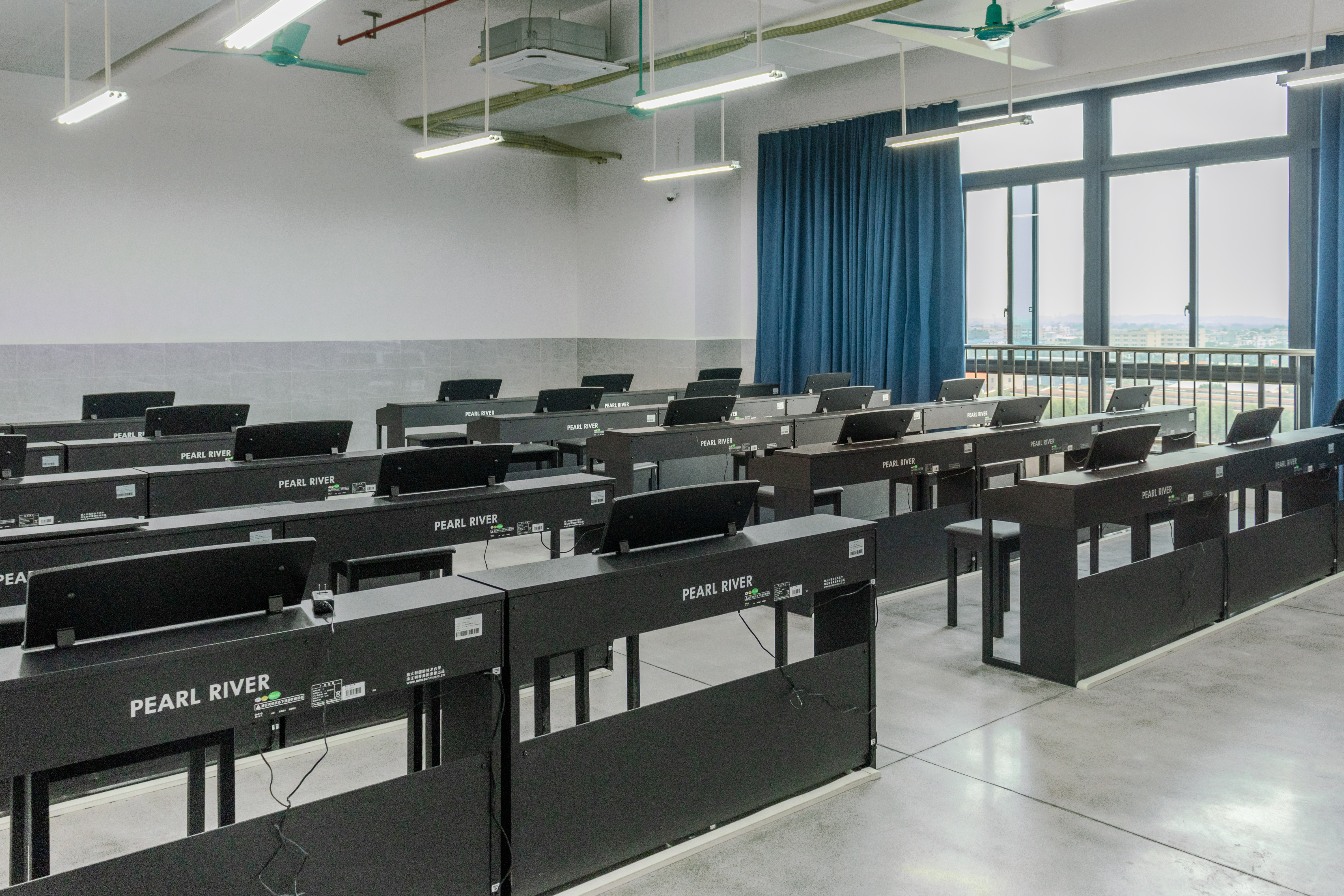 琴房分为教师琴房与学生琴房两类。教师琴房18间,设在治平楼内,其设计以银白色为主,庄重而不失简约之风,老师采用一对一的教学方式,对学生进行专业的声乐指导,关注每位学生的技术细节;学生琴房51间,位于治平楼负一层,采用明黄色与黑色作为主色调,内部配备多样化的器乐,包括但不限于古筝、钢琴及架子鼓等,并为学生提供充裕的练习空间;数码钢琴教室聚集在治平楼的五楼,集视觉、听觉与练习功能于一体,教室内钢琴摆放井然有序。教室采用银白色地板与黑色钢琴的搭配,营造出一种简约而高雅的教学环境。