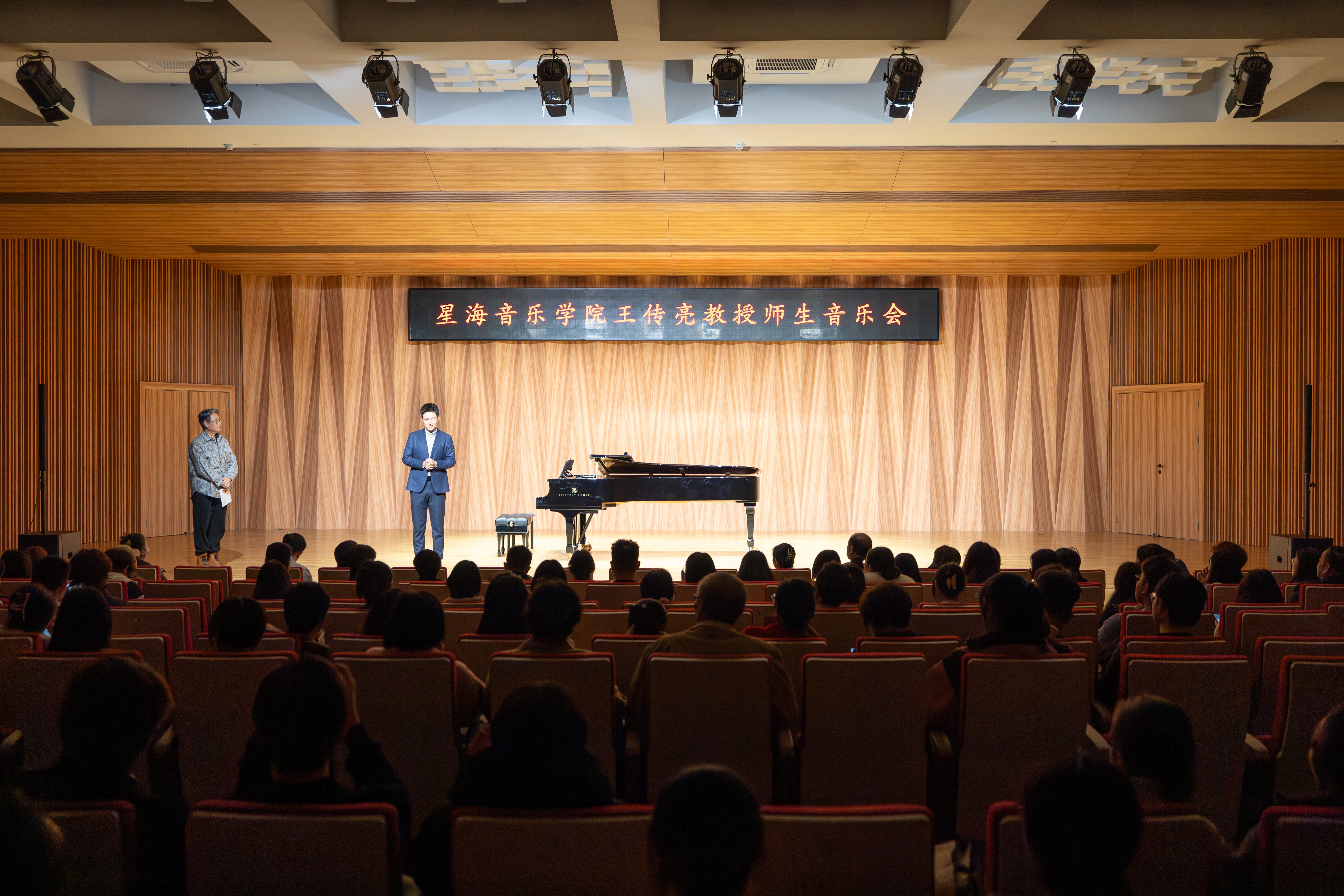 星海音乐学院王传亮教授作为首次来到广州应用科技学院“作客”的嘉宾,对学校的优美环境赞不绝口。他表示,广应科音乐学院的音乐厅场馆设计专业,收音效果极佳,为演出提供了完美的场地条件。特别是世界顶级的九五尺斯坦威钢琴,更是与音乐厅完美匹配,为演出增添了无限光彩。
