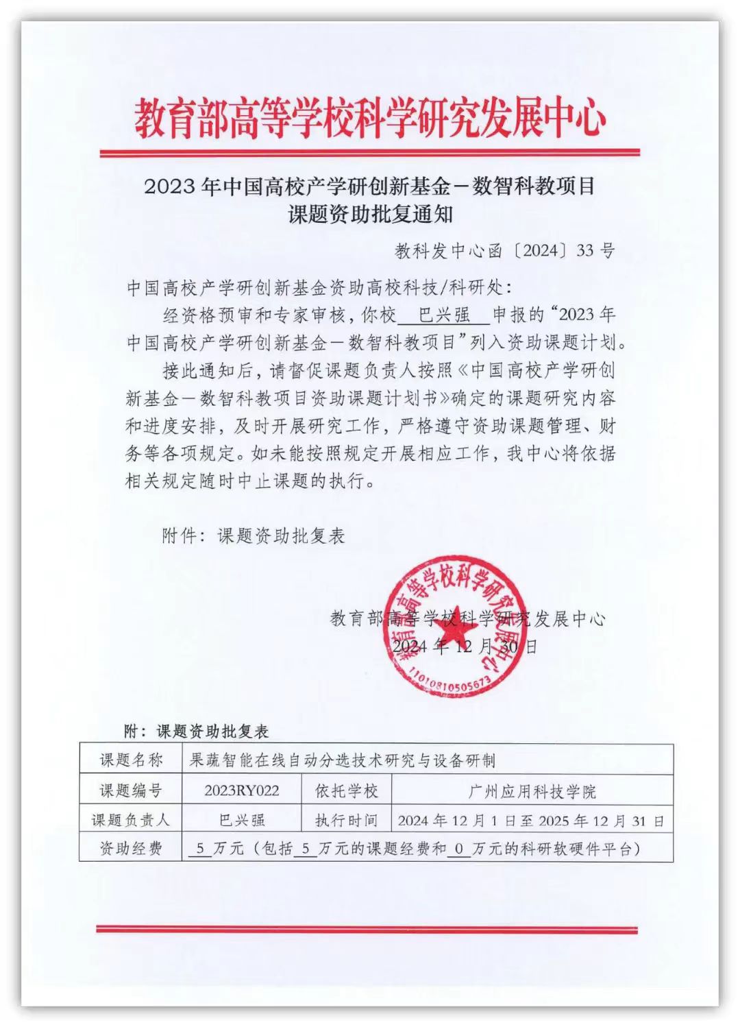 近日,教育部高等学校科学研究发展中心发布通知,广州应用科技学院人工智能与电气工程学院(智能制造学院)巴兴强副教授牵头申报的“果蔬智能在线自动分选技术研究与设备研制”项目成功获批立项,资助金额为5万元。此前,我校计算机学院马利教授牵头申报的《民办应用型大学高质量人工智能通识类数字教材建设研究》以及刘佩伟教授牵头申报的《AI软芯片对焊接、喷涂工艺的诊断算法模型》项目已相继获得教育部产学研创新基金立项资助。此次巴兴强副教授的项目获批,再次彰显了广州应用科技学院在人工智能技术应用与产学研合作领域的显著成效,体现了学校在科研创新方面的持续突破。