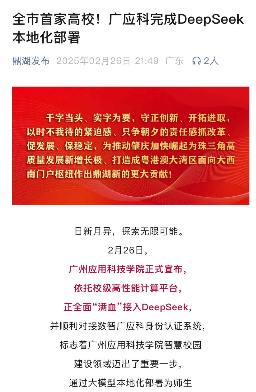 不是单纯所谓的“接入” 而是“满血”本地化部署DeepSeeK 需要强大的算力和硬件配置投入 作为一所民办本科高校 广应科,何以 与众多公办重点本科高校一样 在DeepSeeK横空出世之时 完成这一动作?