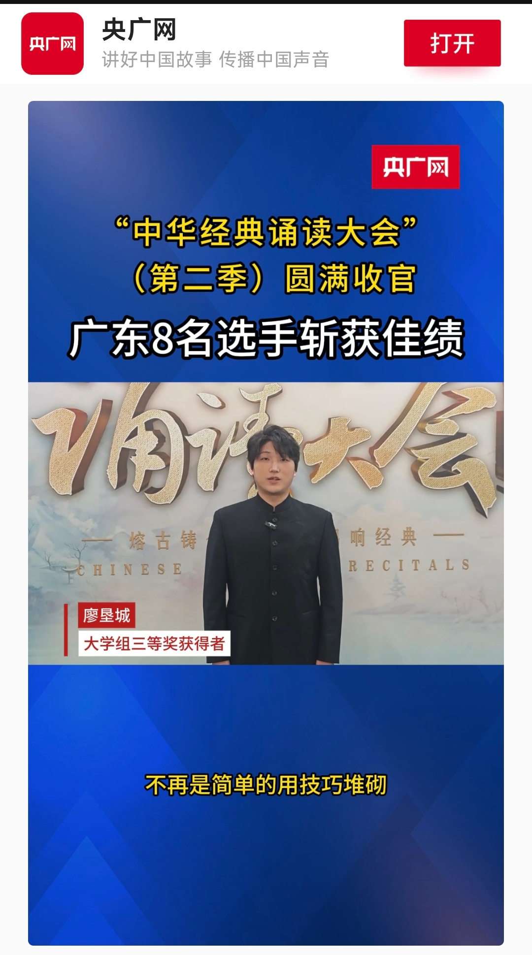 在“中华经典诵读大会”(第二季)全国总展演暨颁奖盛典上,来自我校的廖垦城同学作为广东省代表,以《就是那一只蟋蟀》为参赛作品,参加全国总决选及总展示,荣获全国三等奖。朗诵的这首诗,来自台湾诗人和流沙河分别描述海峡两岸的蟋蟀歌声,这只蟋蟀跨越海峡,成为两岸同胞心灵的桥梁,承载着台湾同胞对故土的眷恋,也勾起大陆同胞的故乡记忆,深刻展现出血浓于水的情感纽带。廖垦城朗诵这首诗,用声音传递文化意象与家国情怀,在观众心中种下热爱文化、期盼团圆的种子,让文化共鸣不断延续。