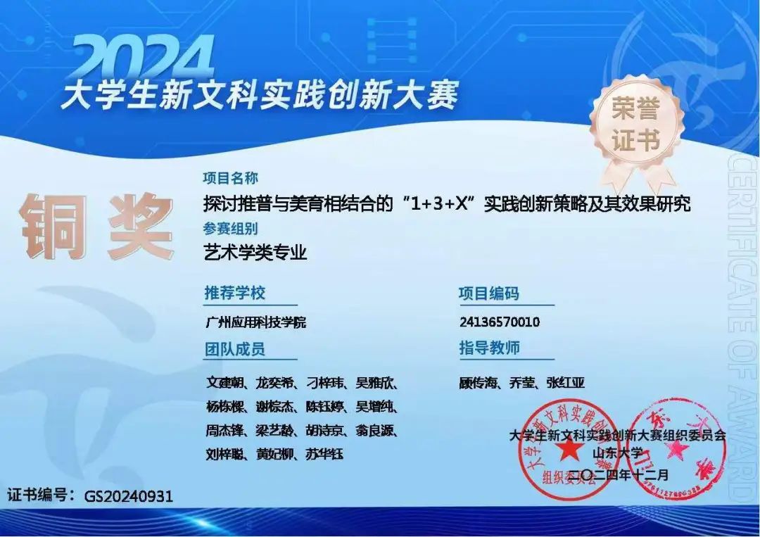 “马兰花开”实践队的出色表现不仅实践在地方,更是通过此次实践不断开花结果。在2024年全国大学生新文科实践创新大赛中,广应科参与新疆“三下乡”的实践队,凭借项目《探讨推普与美育相结合的“1+3+X”实践创新策略及其效果研究》荣获全国铜奖,再次证明了他们通过社会实践后,将学习和实践成果在学术赛事中的运用和展示。这不仅是对“马兰花开”实践队辛勤付出的肯定,更是对我校实践育人工作的充分认可。