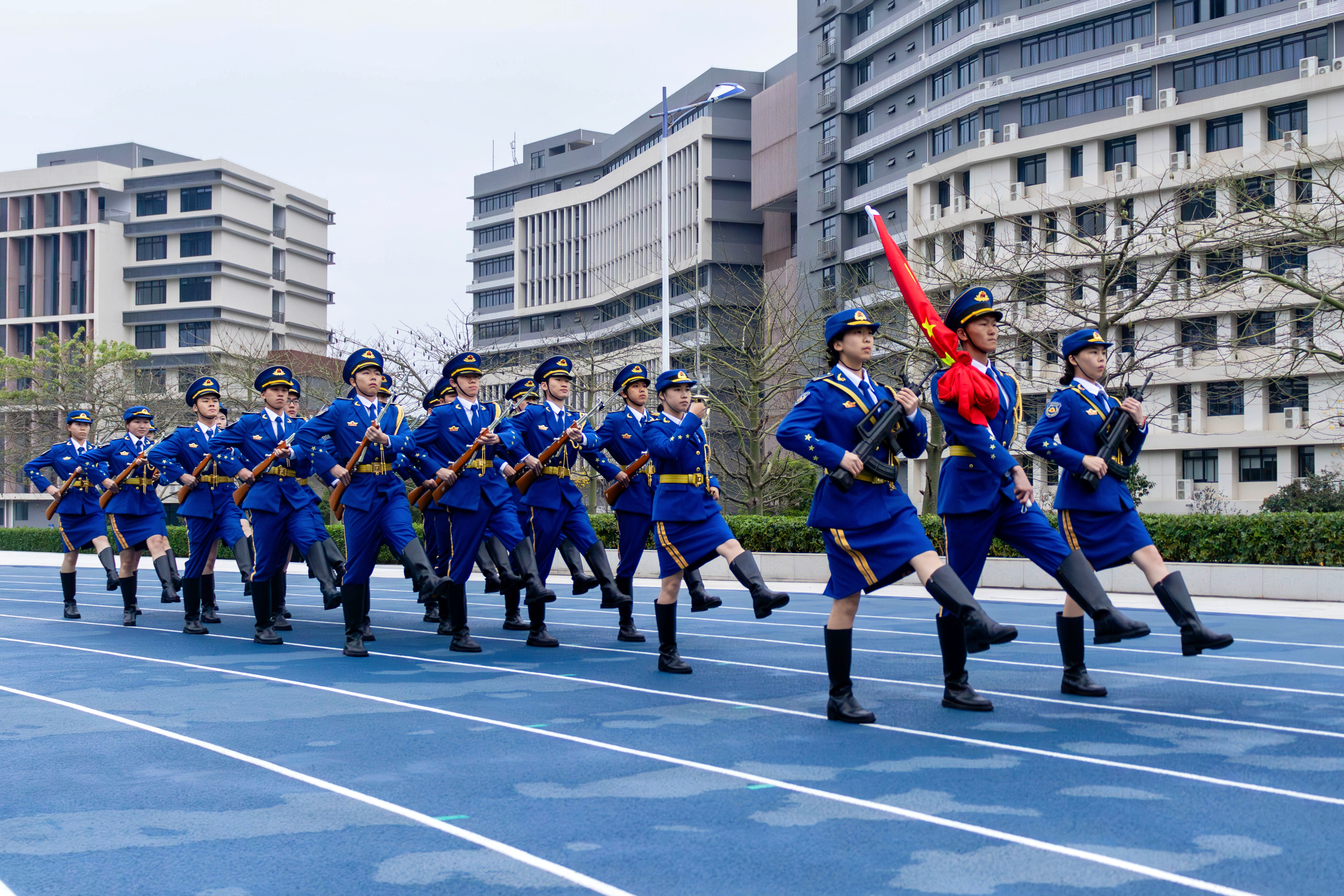 晨光熹微,伴随着指挥员洪亮的口令,国旗护卫队队员们身姿挺拔,步伐坚定,踏着朝霞走向升旗台。国歌奏响,五星红旗在晨风中缓缓升起,划出一道绚丽的红色弧线,那是青春与信仰的礼赞。