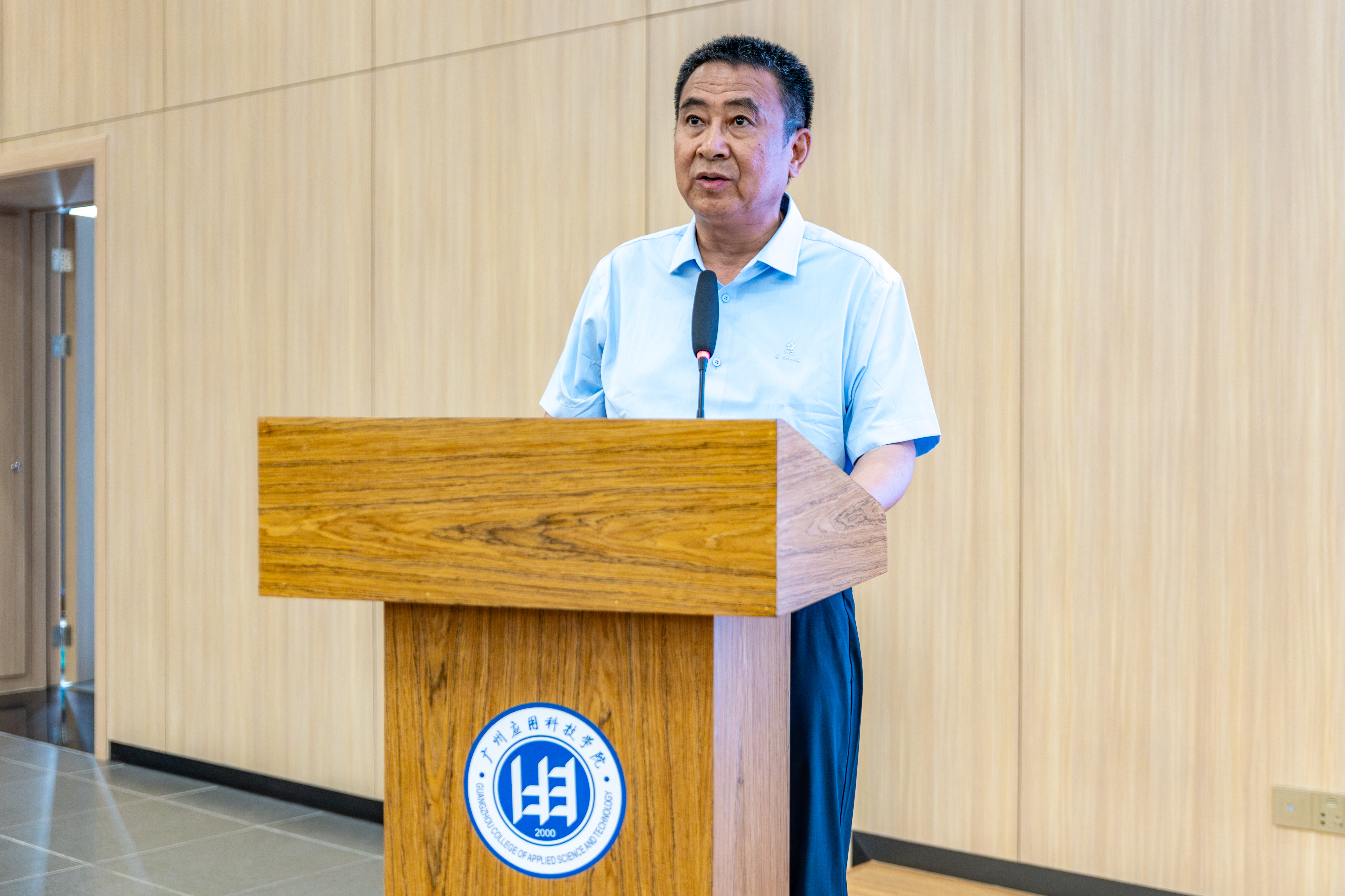 为进一步提升学生国防意识和军事素养,展现广应科国防育人成果,4月23日下午,我校在图书馆一楼报告厅,一场贯通爱国主义教育与思政育人实践的国旗护卫队出征动员仪式庄严举行。广州应用科技学院通过“仪式感”点燃“使命感”,举行国旗护卫队参加第四届广东省学校国防教育成果交流展示活动赛前动员大会,将护卫国旗的神圣职责转化为浸润人心的“大思政课”,生动诠释新时代青年“请党放心,强国有我”的使命担当,让青春誓言与时代强音同频共振。教育厅督导专员、学校党委书记陈光团,党委副书记、纪委书记刘志新,武装部部长胡斌出席会议,各二级学院分管学生工作负责人、全体辅导员、32名全体国旗护卫队成员及武装部相关工作人员参加会议。由武装部部长胡斌主持本次会议。