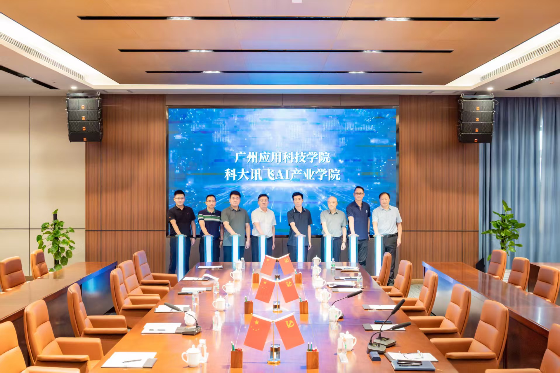 在热烈的掌声中,张光宇校长和黄飞云副总裁分别代表广应科和科大讯飞校企双方,在共建AI产业学院合作书上签字。王睿董事长、张光宇校长、吴明生校长助理、黄卫祖院长、黄飞云副总裁、许振华总监、莫小泉总经理、张士为经理共同为广应科科大讯飞AI产业学院揭牌。根据协议,双方将围绕大模型场景应用示范基地建设、专业学科垂直领域大模型建设、人才联合培养等方面开展广泛合作,协力打造AI赋能高等教育数字化转型与高质量发展的示范标杆。