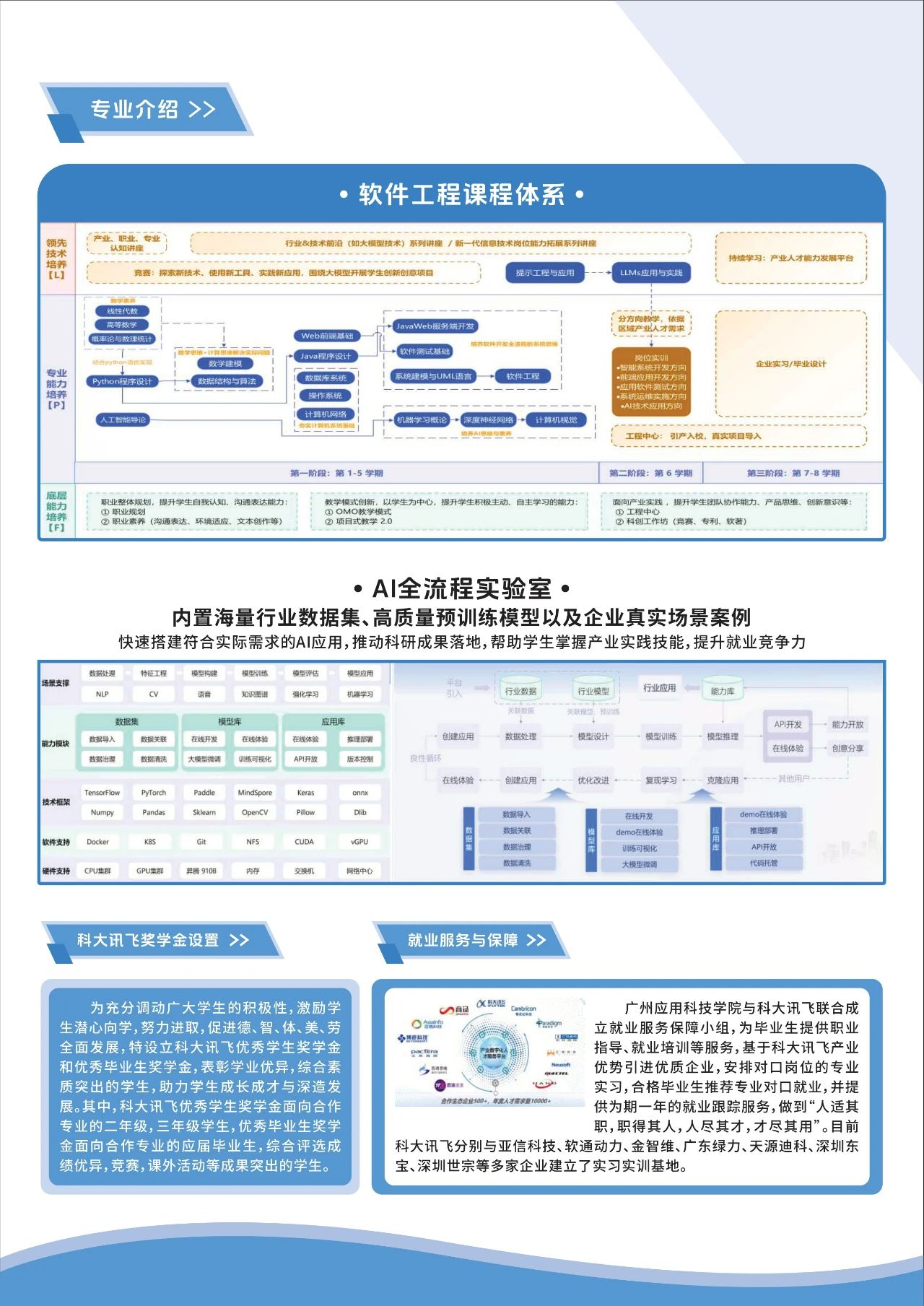 科大讯飞AI产业学院将构建特色鲜明的产教融合培养体系,科大讯飞将为专业教学提供资源支持,包括AI全流程实验室与星火码上平台两大核心技术资源。同时,校企双方还将共同开展科学研究和技术创新,推动人工智能技术的研发与应用,为广东的经济社会发展提供有力的人才支撑和智力保障。学生完成四年全日制学业并符合要求者,将获授工学学士学位。