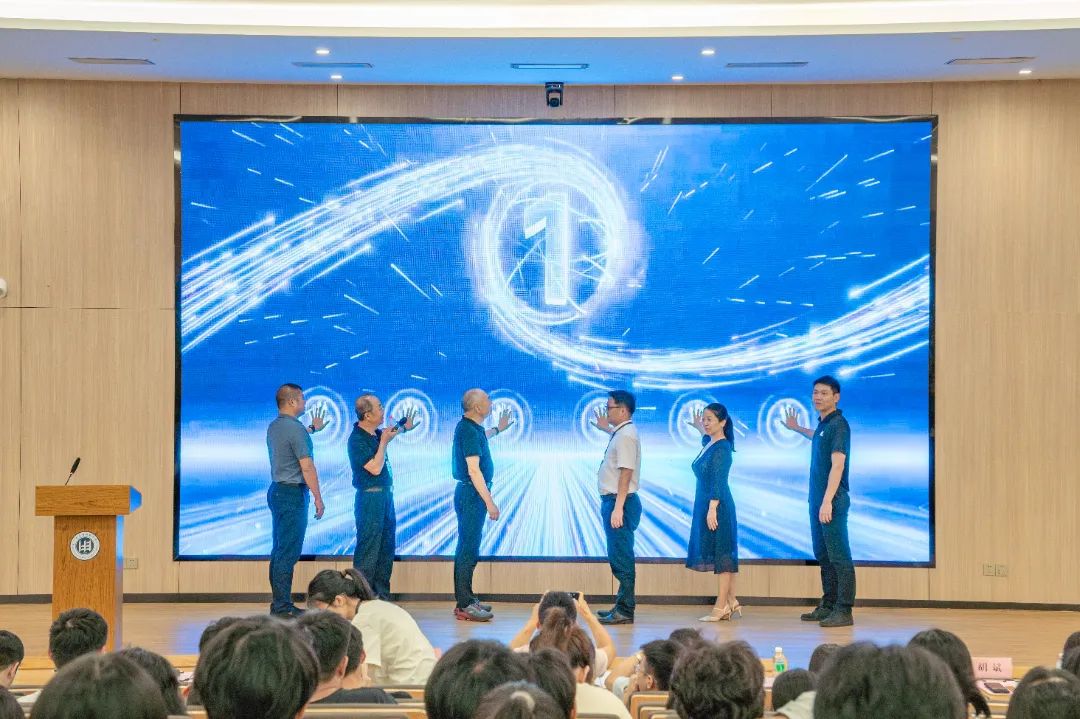 在热烈的掌声中,我校校长张光宇、教务处处长赵卓、学生处处长胡斌、校团委书记郭振、创新创业学院院长陈学年以及肇庆学院创新创业学院院长唐文武共同登台,手掌轻触屏幕,触发数字倒计时特效,在全场目光聚焦中,正式开启这场创新创业赛事,为校赛注入满满科技活力。