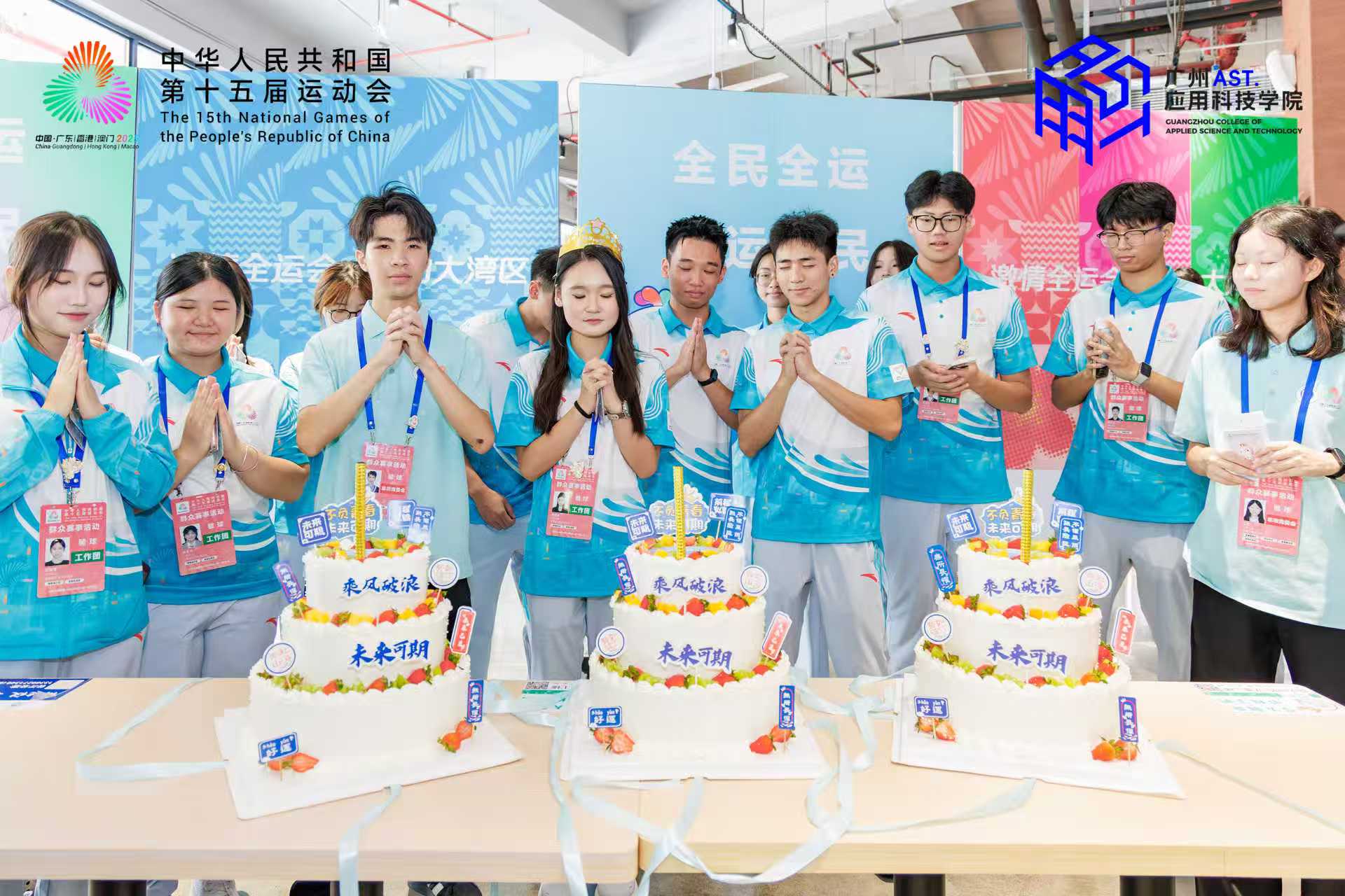 8月18日中午,生日蛋糕被推至饭堂场地中央,印有十五运会标识的特色文创纪念品送到小“寿星”手中,闪光灯映亮年轻的笑脸——这是广州应用科技学院为赛会志愿者定制的温情时刻,旨在传递“以学生为中心”的理念,把对赛会志愿者学生的关心关爱落到实处,让志愿服务工作更具温度与活力。