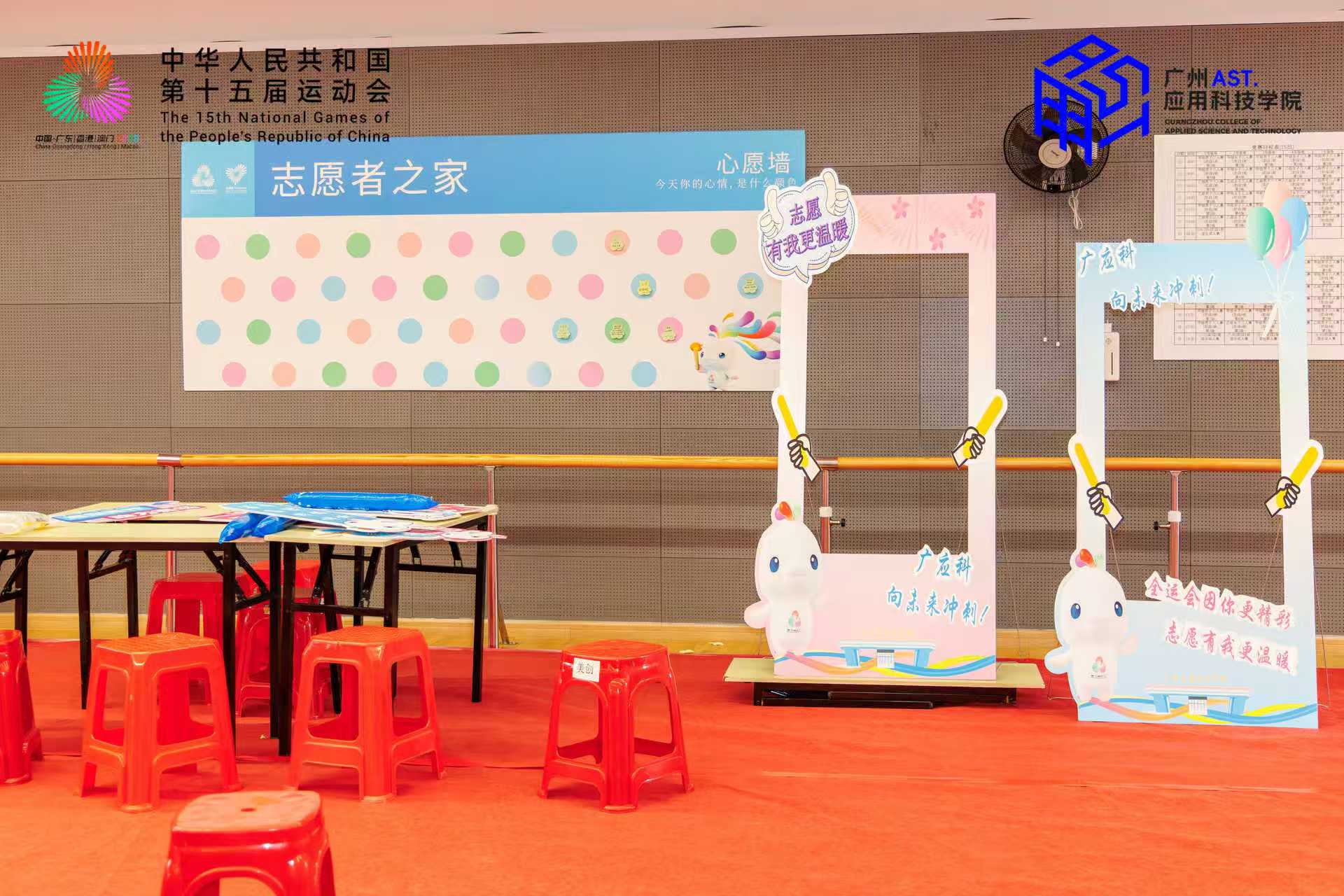 广应科对于这份温暖早有伏笔。为举办好十五运会毽球决赛,学校在赛事期间,开辟体育馆的2间舞蹈室打造成“志愿者之家”,成为志愿者休憩的温馨港湾和专业补给站。空调凉风驱散暑热,两张醒目的展板化身打卡点——一块印着“志愿者之家”,一块写着“小海豚为你更精彩”,成了大家轮岗间隙最爱合影留念的“网红背景板”。广应科设置“志愿者之家”的核心目的是更好地支持、管理和激励庞大的志愿者团队,从而确保赛事的顺利运行和志愿者的良好体验。作为赛事志愿者的专属大本营,“志愿者之家”不仅是“小海豚”们休憩充电的温馨空间,更是情感联结站,让并肩作战的志愿服务时光成为最精彩的青春烙印。这里承载着志愿者们的欢笑与汗水,更传递着“为你,更精彩”的温暖力量!