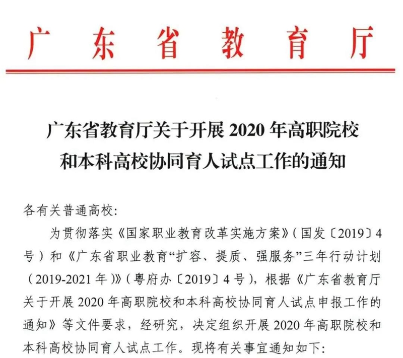 为贯彻落实《国家职业教育改革实施方案》(国发〔2019〕4号)和《广东省职业教育“扩容、提质、强服务”三年行动计划(2019-2021年)》(粤府办〔2019〕4号),广东省教育厅组织开展2020年高职院校和本科高校协同育人试点工作。