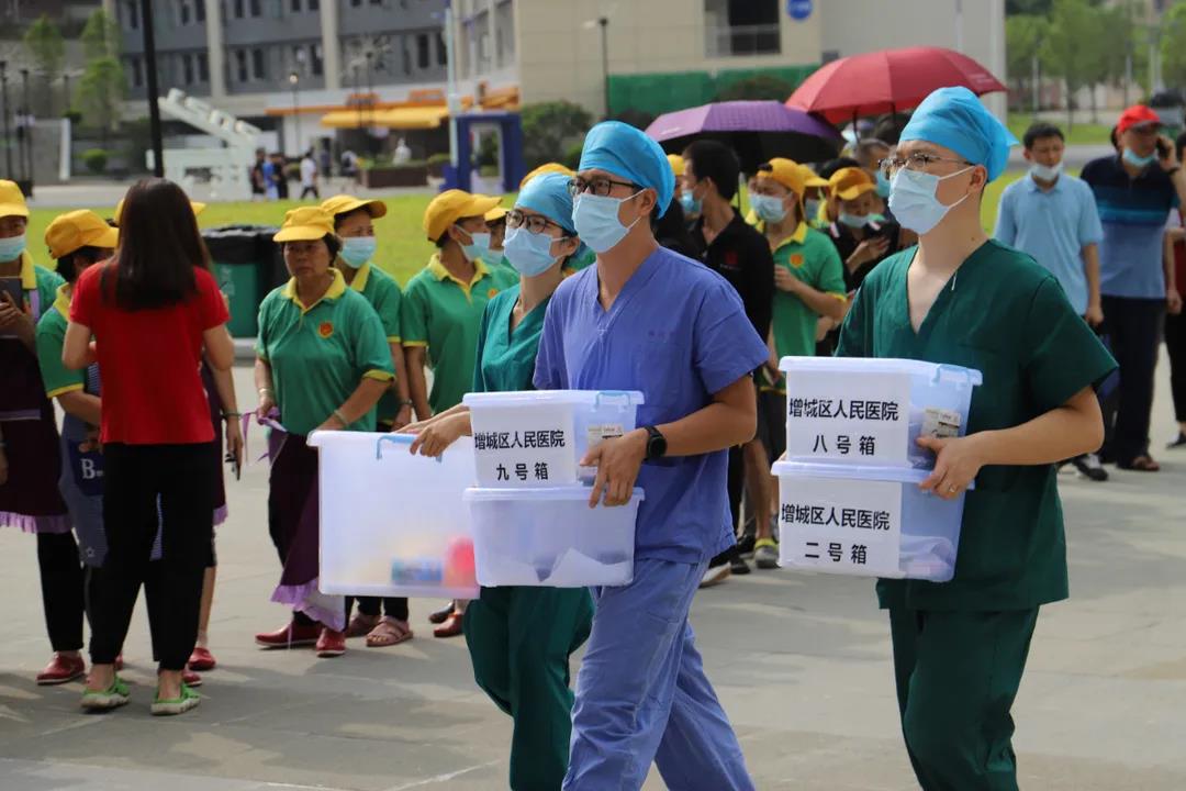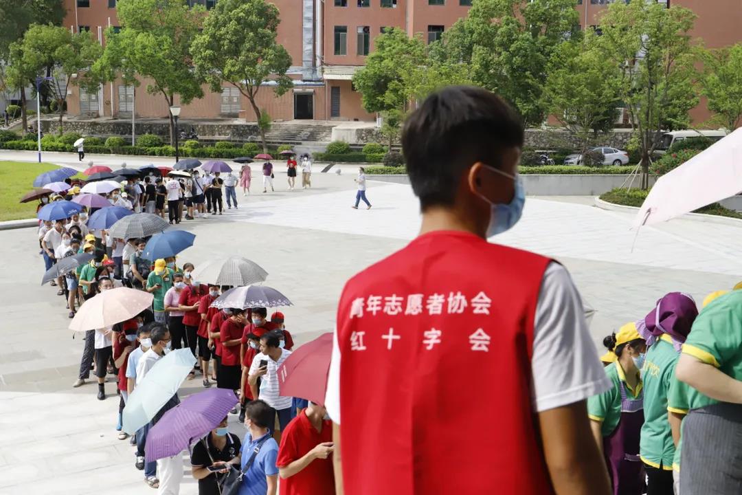 在展开的检测过程中,可以看到,检测现场处处都是认真工作的志愿者们的身影。他们分别来自两院校青年志愿者协会、红十字会、校团委、各院系党务小组,还有增城区政府安排前来支援的党员志愿者、朱村街防疫办,共有上百名人员参与其中,多个部门联动,协助配合,认真负责地完成了工作。