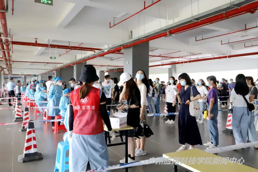 在肇庆市有关部门的支持下,我校所在的鼎湖区组织精干的医护人员来到校内,为师生免费开展核酸检测。我校也根据成熟的全校核酸检测经验,在当天下午3点开始配合医护人员布置检测场地,组织全体新生和教职工有序排队扫码录入信息进入检测准备环节。仅仅用时2个小时,我校肇庆校区师生近2600名师生完成了返校后48小时核酸检测。