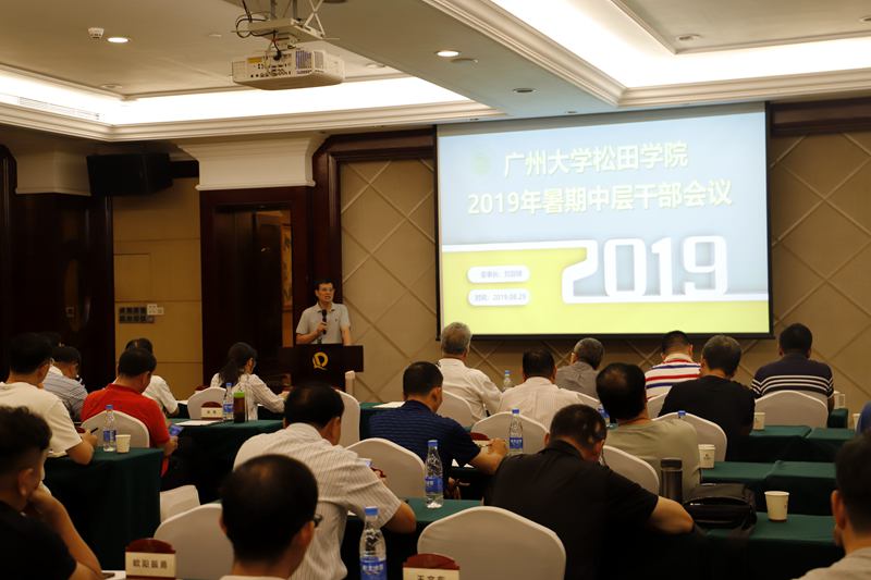 校长庞永师作了《凝心聚力协力筑牢新松田稳定发展之基,砥砺前行全力奋进“十三五”收局之年——广州大学松田学院2019年暑期中层干部会议工作报告》。报告分为“新松田、新成绩”、“找差距、找问题”、“新学年、新作为”三个方面进行阐述。