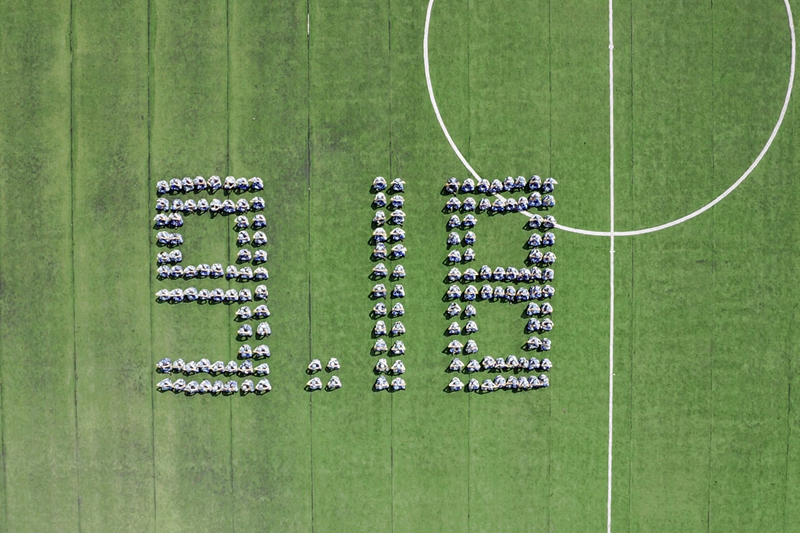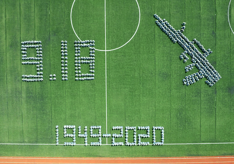 2020年9月18日,“九一八事变”爆发89周年之际,当天上午,在我校足球场,2020级新生军训团学生在教官的带领指挥下,组成多个造型图案,感怀先烈,不忘国殇。