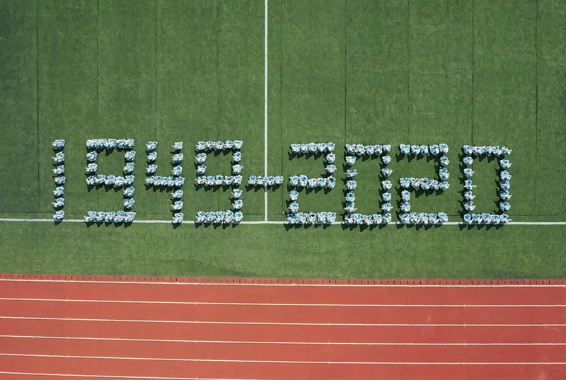 从无人机航拍可看到,“9.18”、“1949—2020”和一把钢枪的图案显现在学校运动场。